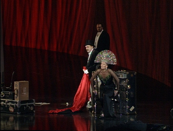 For the longest time the classic 1995 Glyndebourne recording of Janáček’s Věk Makropulos was the only video option. It’s now been re-released on DVD and Blu-ray in a completely remastered version. I watched the Blu-ray and it’s as well restored as the companion recording of Peter Sellars’ equally classic Theodora. As it’s drawn from a Channel 4 broadcast the picture is 4:3 and it’s presented here formatted for wide screens in what is, apparently, called “pillarbox” mode in the UK. At any event, the picture is excellent; certainly the equal of many more recent recordings, if not quite of the best HD quality. The sound, stereo only, is decent but a bit “boxed in” and the voices often seem to balanced a long way back.