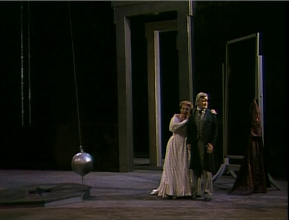 The second instalment of Patrice Chéreau’s 1980 Bayreuth Ring cycle is set, like Das Rheingold, in a sort of industrial bourgeois late 19th century. One would almost say steampunk if that were not an anachronism. Actually the “industrial” side is much less evident than in the earlier work. There’s a sort of astrolabe/pendulum thing in Valhalla but that’s about it. Setting aside, the story telling is very straightforward; so much so that it takes a real effort of the imagination to get into a mindset where this production could ever have been considered controversial. It’s quite literal; Brünnhilde has a helmet and breast and back plates (worn over a rather severe grey dress), Wotan has a spear, Siegmund has a sword. There’s not an assault rifle or light sabre to be seen. It is though dramatically effective.