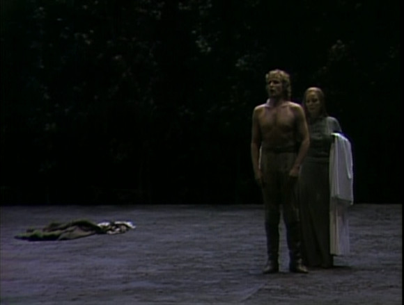 Act 2 is also strong. Hannah Schwarz continues as a very dignified and finely wrought Fricka. Gwyneth Jones is both convincingly girlish and slightly sinister as Brünnhilde, singing with strong and steady tone. Even Donald McIntyre’s Wotan is an improvement on Das Rheingold. It’s not that he is any more regal. He isn’t. It’s that his introspective, depressed even, Wotan is quite convincing, if very unconventional. At times, he’s almost speaking the part rather than singing it but, somehow, it works. The Brünnhilde/Siegmund/Sieglinde scene is extremely touching and y, with his shirt off, looks, as well as sounds, heroic. Altmeyer’s portrayal of Sieglnde makes a rather strong case for her as a sufferer from PTSD, which rather makes sense.