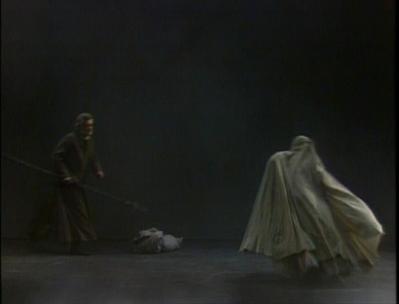 Erda rises, inevitably, amid much smoke. She’s portrayed as a sort of animated bundle of laundry from which a woman eventually emerges. She (Ortrun Wenkel) sings well enough. The confrontation between Siegfried and the Wanderer is again a bit clownish and leads to the Valkyrie rock which is, of course, shrouded in smoke. Siegfried wakes his bride and Gwyneth Jones gives us a very decent Heil dir Sonne! Then it all goes a bit awry. The duet should be ecstatic and really needs to be a blending of the two singers and the orchestra. This simply doesn’t happen. Jung’s lack of ringing high notes coupled with Boulez’ breakneck tempo and unromantic approach fatally undermine the music. It may even be made worse by Jones’ rather bright tone which just doesn’t blend at all with Jung.