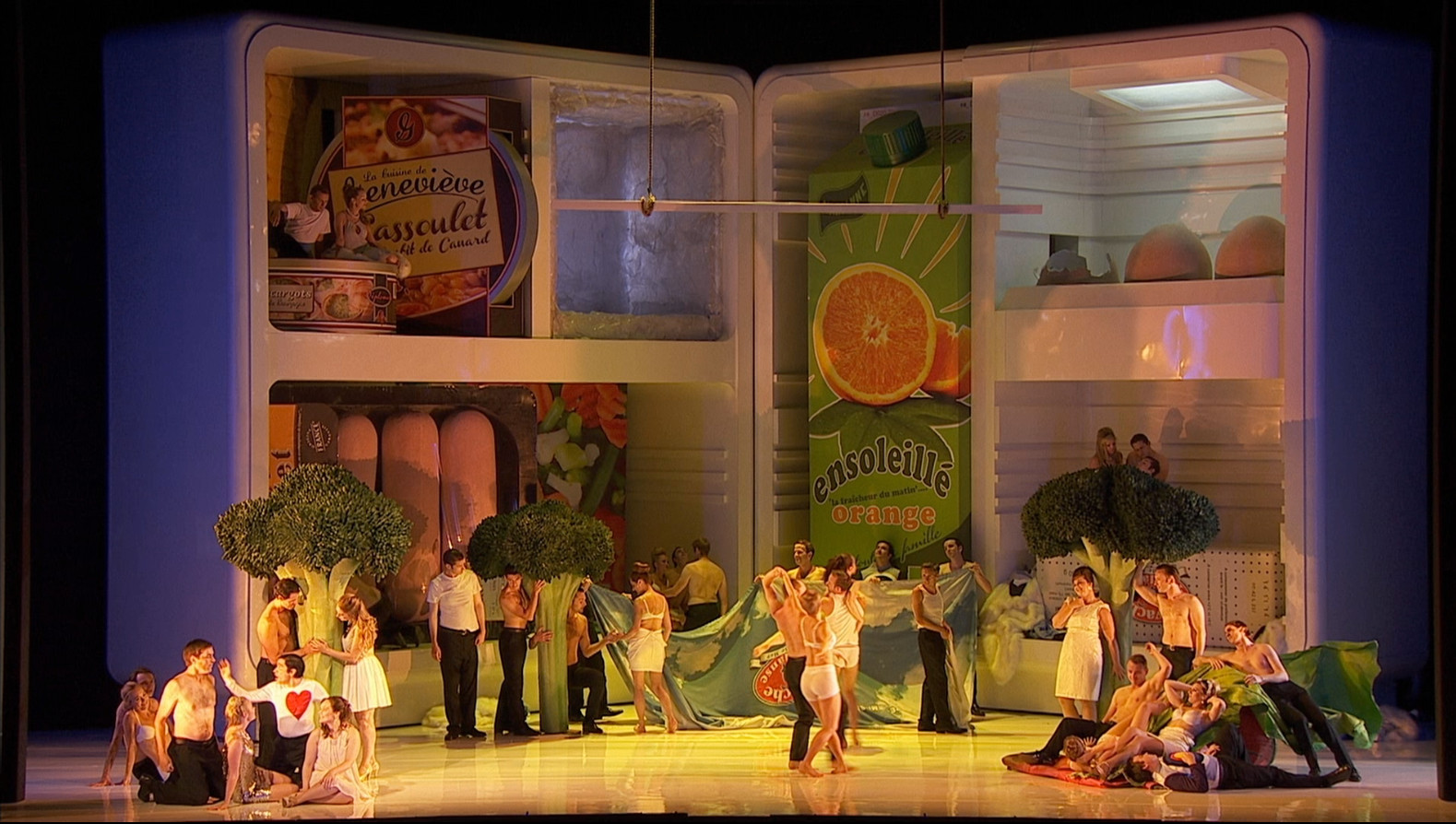 It starts out very well with the allegorical prologue set in a giant, and very French, refrigerator. Cupid, brilliantly sung by Ana Quintans, is arguing with Diana, Katherine Watson, about whether love or chastity will triumph. The chorus, bearing giant vegetables join in. We learn that Diana has taken Hippolytus and Aricia under her protection. Jupiter descends and announces that Love will have dominion for one day each year. We also see how dance is going to be integrated into the production. Typically the singers hang around and the dancing goes on around them. We shall see this again later.