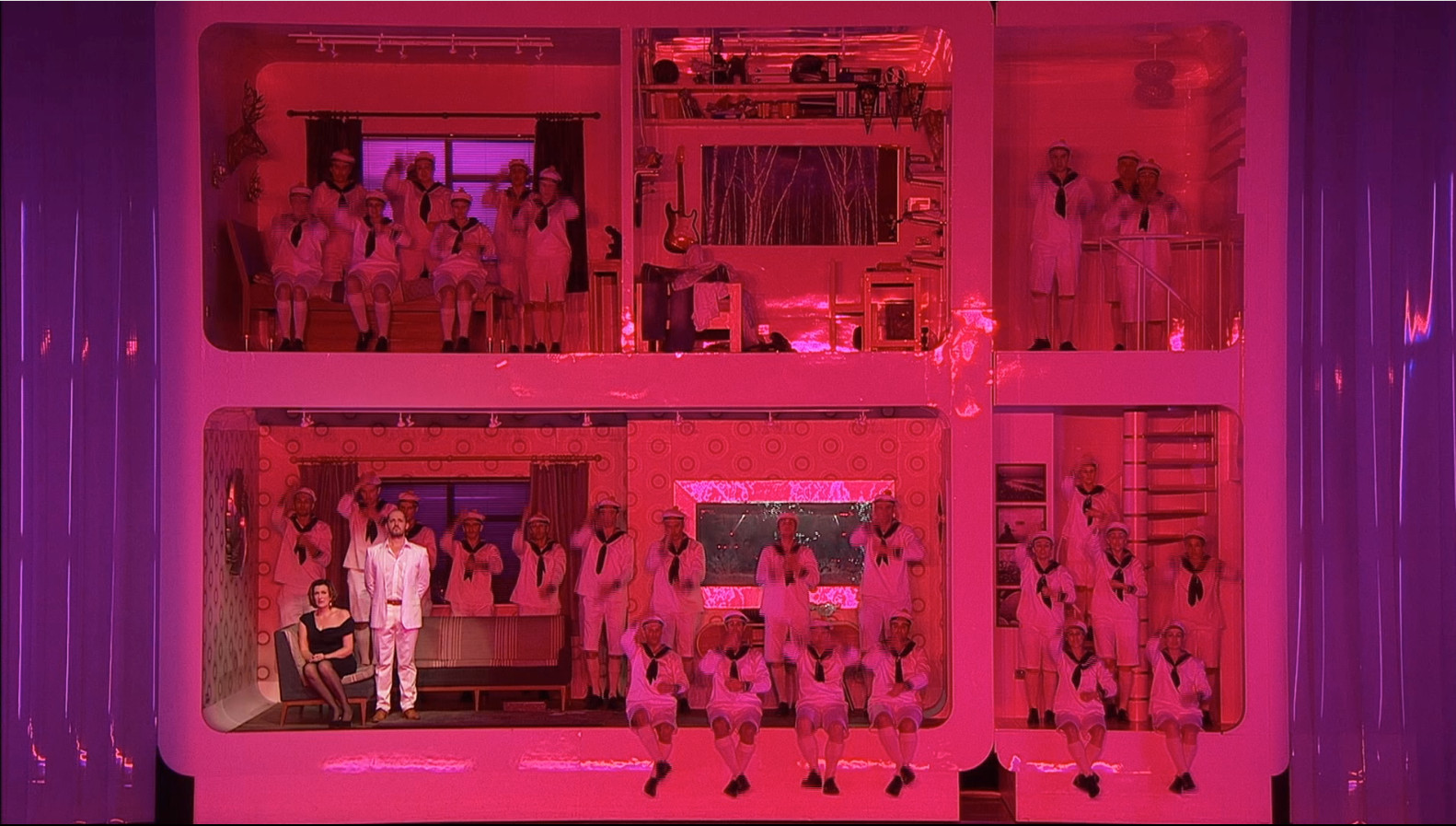 Act 3 seems to be set in a hotel. Phaedra and Hippolytus converse at cross purposes. Phaedra thinks Hippolytus loves her. Theseus returns unexpectedly and hears enough to compromise the two. Hippolytus takes the blame on himself. Theseus prays to Neptune to punish Hippolytus. Then, quite suddenly, after all this heavy stuff, the set turns bright pink and Cupid, the dancers and the chorus enter dressed as rather camp sailors and perform a jolly little choral dance number while Theseus and co sit around looking like death warmed up.
