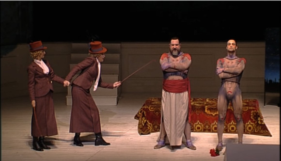 Thanks for bringing this one back to light. I absolutely love this interpretation. The whole “this is an opera and we know it, and so let’s run with that” thing works for me. I’m pretty sure the double-cast thing would work with most operas, but this one seems ripe for it. I think the double-cast gives us a chance to see different sides of the characters by how they interact with their doubles. Of course, sometimes the singers act opposite the actors versions of their partners (as in the Konsanzes/Belmontes mixing it up in the photo above. I think I am making this performance sound more confusing than it is.