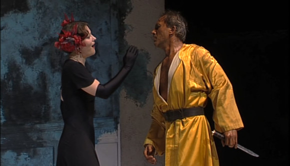 There’s lots going on in Neuenfels’ treatment. There’s lots of interaction between the doubles, who share the dialogue, as well as between different characters. There’s a fair amount of dismembered bodies and children spitted on pikes. Blonde gets the dominatrix treatment , though here in an English riding habit rather than leather mini and boots. (Have all German theatre directors had rather unusual experiences with English women. It sometimes seems so). FWIW parts of Blonde’s dialogues are in English. The reference to being “chicken hearted” in “Frischt auf zum Kampfe” provokes a rather literal chicken-and-egg scene in which Death makes a rather odd appearance. In the “discovery” scene the Osmins make rather heavy use of a basket of snakes and the whole affair concludes with Selim reading a Mörike poem and saying goodbye to Konstanze. On the video there’s no applause and no curtain call. My description makes it sound chaotic but really it isn’t though, as with all such productions, there are bits that probably made more sense to the director than the audience. It really hangs together rather well and makes for a pretty satisfying theatrical experience.