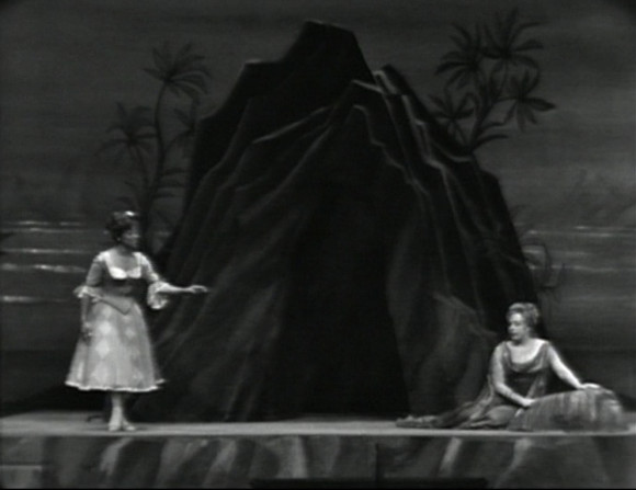 The production is extremely literal. It’s set in an 18th century house with liveried servants and the stage sets for Act 2 are very stagey though there’s some suggestion of an interesting lighting plot though it’s not really possible to judge in B&W. Zerbinetta’s men are straight out of the commedia and Ariadne looks like a classical Greek. Bacchus gets the only interesting outfit. It’s a bit like Stephen Fry as a Roman centurion. So, the action unfolds exactly per libretto and Günter Rennert’s contribution seems limited to designing some basic blocking.