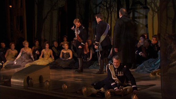 Lepage’s production is set in a fantasy La Scala where Prospero is “staging” his revenge. Characteristically, there are elements of modern circus with an aerialist sometinmes doubling for Ariel and some grotesque acrobat/dancers. It’s recognisably Lepage and pretty effective for a piece that has large elements of magic and deception. There’s a fair bit of what seems to have become a Met staple, the advent calendar placing of the chorus; sometimes on a “backstage” gantry and sometimes in the boxes of fake La Scala. Costumes are mostly dress uniform though Prospero wears his loosely over serious body art and Miranda gets a sort of hippy outfit.