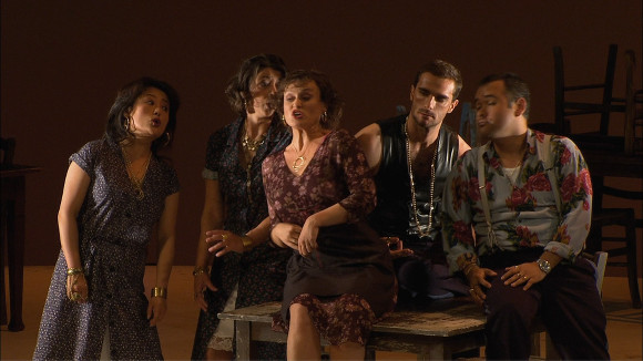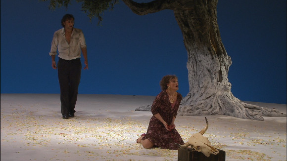 Matthias Hartmann’s staging of Carmen for the Opernhaus Zürich recorded in 2008 is starkly simple but very beautiful and provides a perfect vehicle for the considerable talents of Vesselina Kasarova and Jonas Kaufmann. The set consists of a plain backdrop and a raised elliptical disk, reminiscent of a bull ring. A few, very few, props are added as needed. A dog lies asleep at the front of the set (replaced by a cattle skull in the final act).