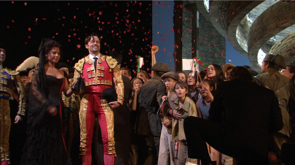 1.crowdThe cast is generally pretty strong.  Barbara Frittoli is an affecting Micaëla, singing consistently sweetly and generally inhabiting the role convincingly.  Keith Miller is a more interesting Zuniga than most with a distinct touch of menace.  Teddy Tahu Rhodes is a bit dry toned but he’s a commanding physical presence as Escamillo.  Chorus and Orchestra are just fine and Yannick Nézet-Seguin, making his Met debut, conducts a lively and atmospheric reading of the score.