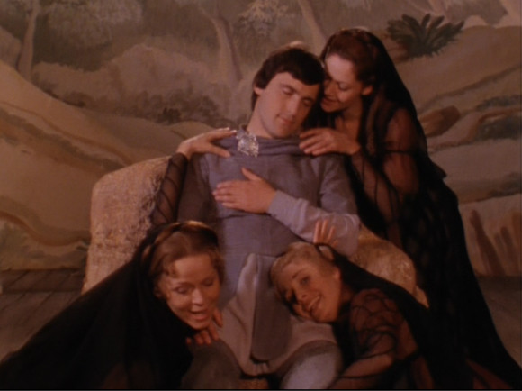 There’s also the matter of textual changes. Sarastro becomes Pamina’s dad, making this a very psychological telling of the tale (but hey it’s Bergman right? what did we expect). The last shot of Sarastro walking off with the flute is a stunning image. Notice too the there genii in their first appearance –during the quintet between the 3 ladies Tamino & Papageno–and tell me you haven’t seen that before: from Opera Atelier. Now of course Marshall did it long AFTER Ingmar had the idea. In Bergman it’s quite a bit different, the balloon coming down while the women are immobilized magically by some sort of net, giving us the first clue that the Queen & her hench-women might not be as nice as they seem.