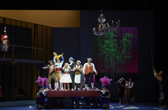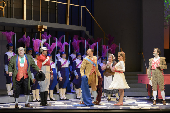 The COC’s new production of Rossini’s The Barber of Seville opened last night at the Four Season’s Centre. The production is by the Catalan collective Els Comediants, the same team who did La Cenerentola a few seasons back, with direction by Joan Font and designs by Joan Guillén. It’s a riot in a good way. It’s bold, colourful and very well choreographed. There are giant props; for example a huge guitar from which Almaviva sings his serenade and a giant pink piano which serves for all kinds of shenanigans. A lot of the “sung action” is doubled by actors in a sort of on stage projection cube. Scene changes are “on the fly” and the curtain only comes down for the interval and the end. Bold, clever, slick.