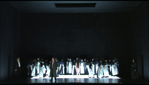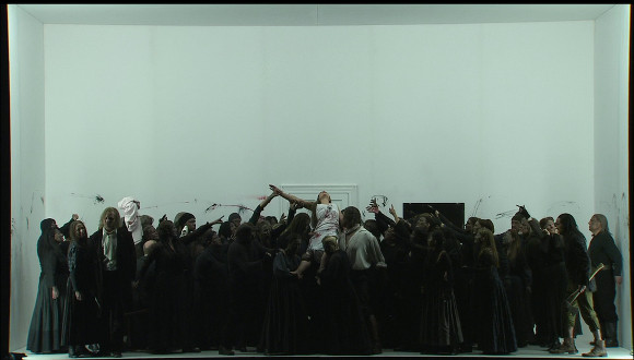 Well, for the 2008 Zürich production Harnoncourt collaborated with Martin Kušej who appeared to share his views and chose to set the piece in the 1840s. He also sets in a white room set in the middle of a black stage. There’s a door, a mirror and a washbasin. All four principal characters are on stage the whole time. Costumes are black and grey. The only colour in the piece is red and you can guess what that’s all about. Most of the time the chorus sings from off stage but on the odd occasion they enter the room they are very odd indeed; hooded with darkened faces. In the scene where they denounce Genoveva they smear dirt everywhere then throw fish at the girl. In the final scene they are equally grubby and sing a dirge like version of the final hymn while unwrapping multiple statues of the Virgin Mary. All this while a stony faced Siegfried and a terrified Genoveva have sung of their undying love for each other without ever making eye contact. And, as they say, that’s not all. Each act is preceded by a sort of silent mime sequence. For example at the beginning of Act 4, a much dishevelled Genoveva appears to be playing leapfrog with the wash basin. No doubt the director has an explanation for all this but we don’t have a glossary and it comes across as just plain weird and rather incoherent. It’s also pretty creepy. Genoveva gets groped a lot, usually while praying.