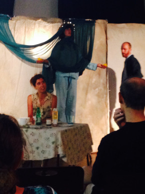 The first auction item is a roll of wallpaper which takes us into The Yellow Wallpaper (music: Cecilia Livingston, libretto: Nicolas Billon). This is a piece about what a young woman may or may not be seeing or hearing. Certainly no-one else does. Shades of Gaslight and The Turn of the Screw. Nicely done by Stephanie Tritchew as the woman on the edge of madness and Chris Enns as her unsympathetic physician/husband. This is also the first time for Sonja Rainey’s projections which make such an impact in a show where sets, costumes and lighting all fit in two bicycle trailers.