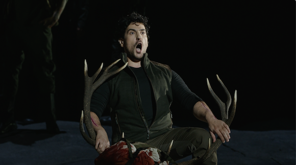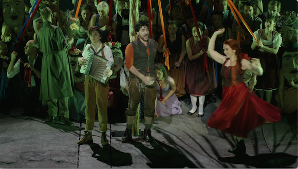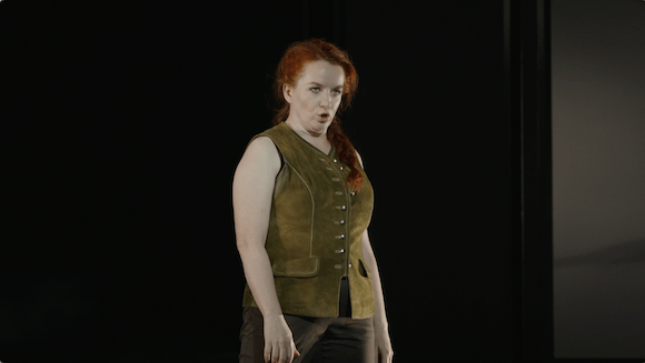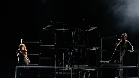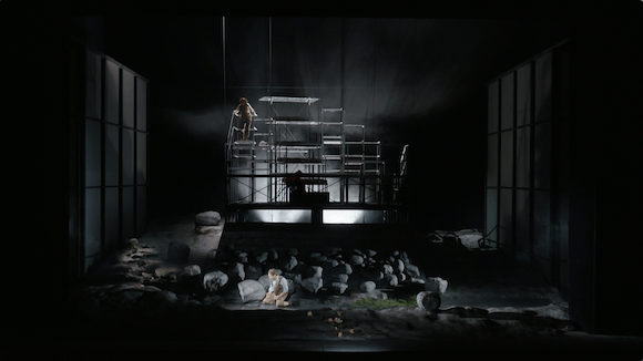 The production is directed by Barbora Horáková Joly. It’s basically given a modern setting with projections used a lot though on video it’s hard to see what they are about. For some reason between acs 2 and 3 we switch from a naturalistic setting to a sort of scaffolding arrangement; though with rocks and lots of running water. I think the ambiguity/confusion in acts 3 and 4 may have been deliberately created by the director. In the source material it’s pretty clear that Gellner does kill Hagenbach. The whole thing is very busy and rather dark.