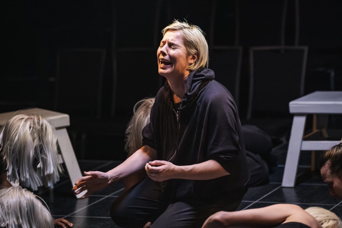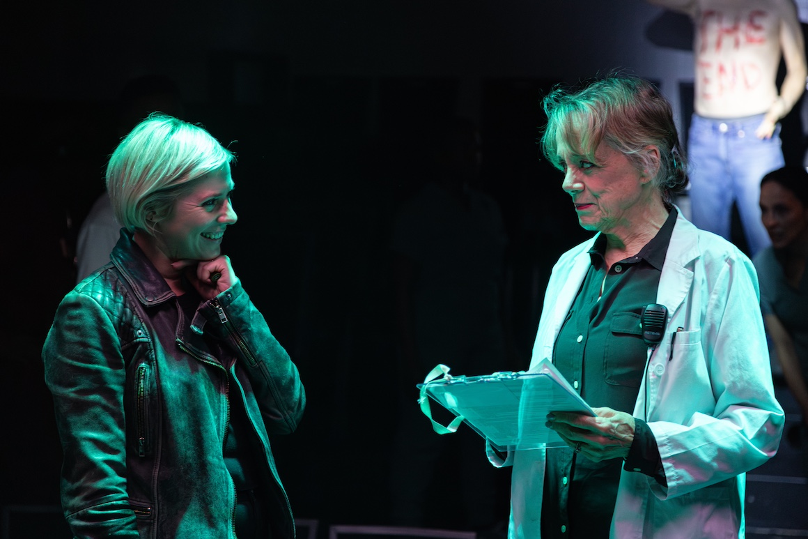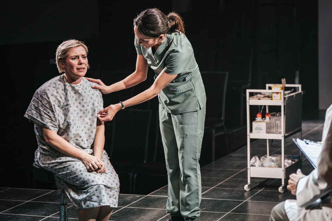 As theatre it’s extremely well done. Director Diana Bentley and Movement Director Alyssa Martin have found an approach to using the space that, coupled with brilliant lighting (Bonnie Beecher and Jeff Pybus) and sound design (Thomas Ryder Payne) makes scenes like the detox episodes almost overwhelmingly intense with the Ensemble wigged as alternative Emmas or in crow-like black creating truly infernal chaos. Cleverly Emma’s doctor, therapist and mother are all played, with subtle differences, by Fiona Reid. All authority figures look alike to Emma.
