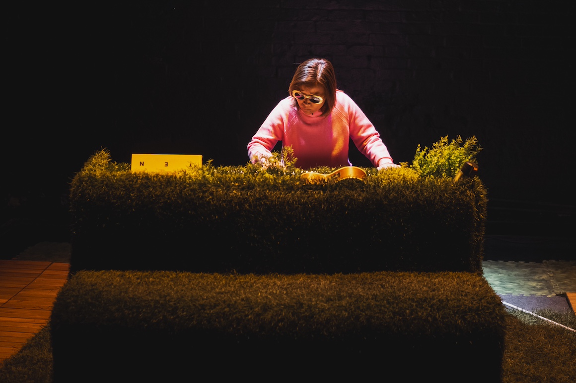 In some ways it’s very simple. It’s in the very small extraspace at TPM and the set is maybe 5m square. It resembles a seaside park. There’s a grass covered couch, a boardwalk area, a beach and the sea. Chong circumnavigates this space and talks, sings and plays to us. Musically she’s rather accomplished! Her words are captured by rather bad speech recognition software on a cloud above the stage.