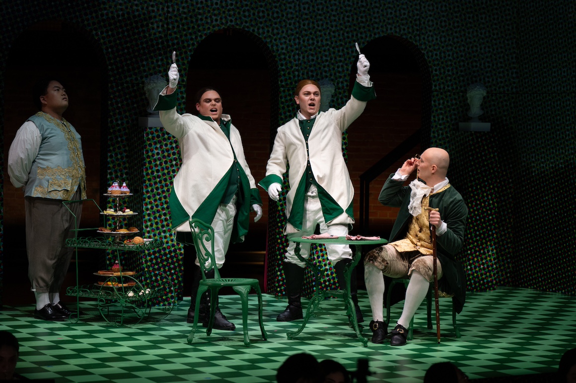 It’s UoT Opera so there are two casts. I saw the second performance by the first cast. Theodosakis gets first class acting out of the whole cast with, unsurprisingly, particularly exuberant physical comedy from Teresa Tucci’s Despina though Dante Mullin-Santone’s sinuous Don Alfonso is not far behind. The sisters are sung by Jordana Goddard (Fiordiligi) and Keenia Koutorjevski (Dorabella). Both are excellent both in their big solo numbers and in the various ensembles. There’s a real sense of Mozartian style, coupled with adequate oomph. The boys are a bit more variable. George Theodorakopoulos Guglielmo) is strong throughout while Cameron Mazzei (Ferrando) is fine in the ensemble work but is challenged by the big solos. Vocally Mullin-Santone does an excellent job of sounding like an older man and Tucci navigates the vocal silliness of Despina rather well while singing the straight bits properly. It’s just a pity that there’s no place for her excellent coloratura.