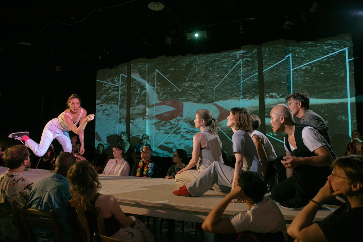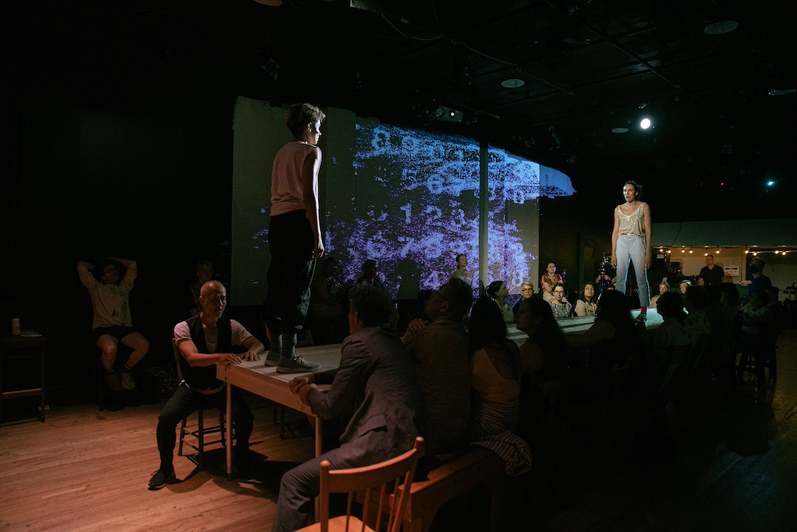 And so to part 2; the “play” Elephant (as in “the elephant in the room”). People familiar with bluemouth’s work (not me!) appeared to know what to expect. It’s a curious mash up of experimental theatre techniques. It’s (loosely) structured around the progressions of a dinner party with each element described as a “course”. There are interactive games (some of which seem to be “genuine” and others “fixed” to provide a transition point). There are the readings that we also got with Lucy AI. There are not especially interesting pop songs and improvised dance; both with an element of audience participation. Parts of the action are videoed and projected onto giant screens. It feels fairly spontaneous but muddled and lacking any clarity of purpose or direction.