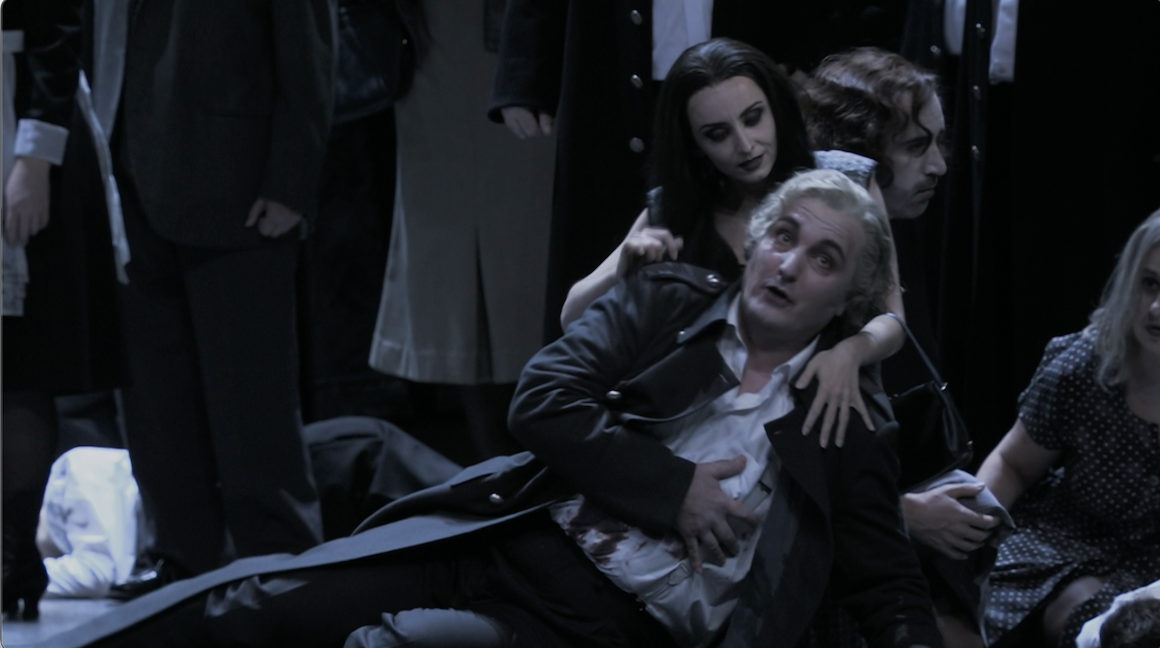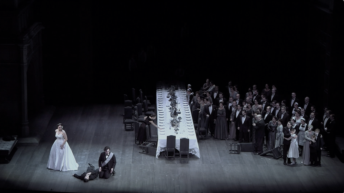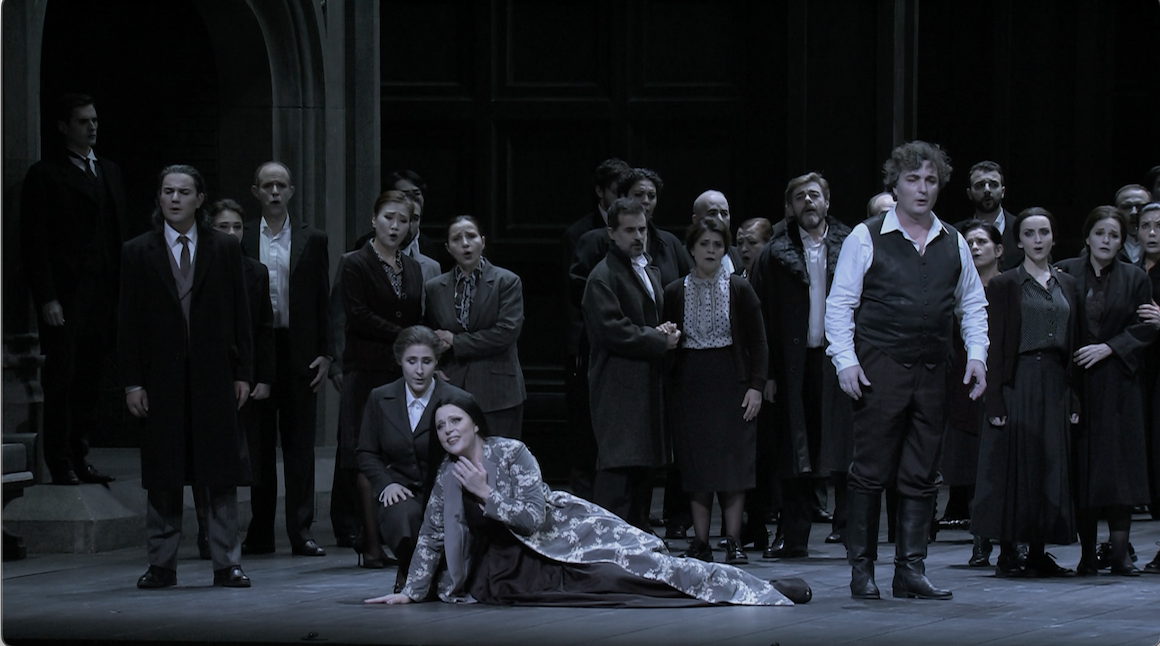 Christof Loy’s production of Verdi’s Macbeth filmed at the Liceu in Barcelona in 2016 is grey, very grey. Costumes and lighting are such that one might think one is watching a black and white film. The first, brief, touch of colour; some lights and bunches of flowers appears at the beginning of Act 4. Beyond the greyness the vibe is essentially late 19th century and it’s pretty sparse. It’s also very dark; at times almost unwatchably so on video (even Blu-ray).