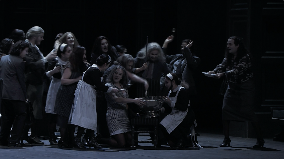 Musically and dramatically it’s rather interesting and good. It’s the 1865 Paris version including the ballet but in Italian with the 1847 conclusion (Macbeth dies on stage). There are some interesting touches. The witches are basically the Macbeth’s household staff with the addition of facial hair. The two witch scenes are both also a bit mad, especially the potioning in Act 3. The apparition scene is nicely done with the future kings in dress uniform in glass display cases emerging from the stage floor. The ballet (choreography by Thomas Wilhelm) looks like it’s going to be like, say, a conventional production of Les Sylphides but it gets a bit more sinister. The dancers are bare foot and several are men in drag. It’s effective.