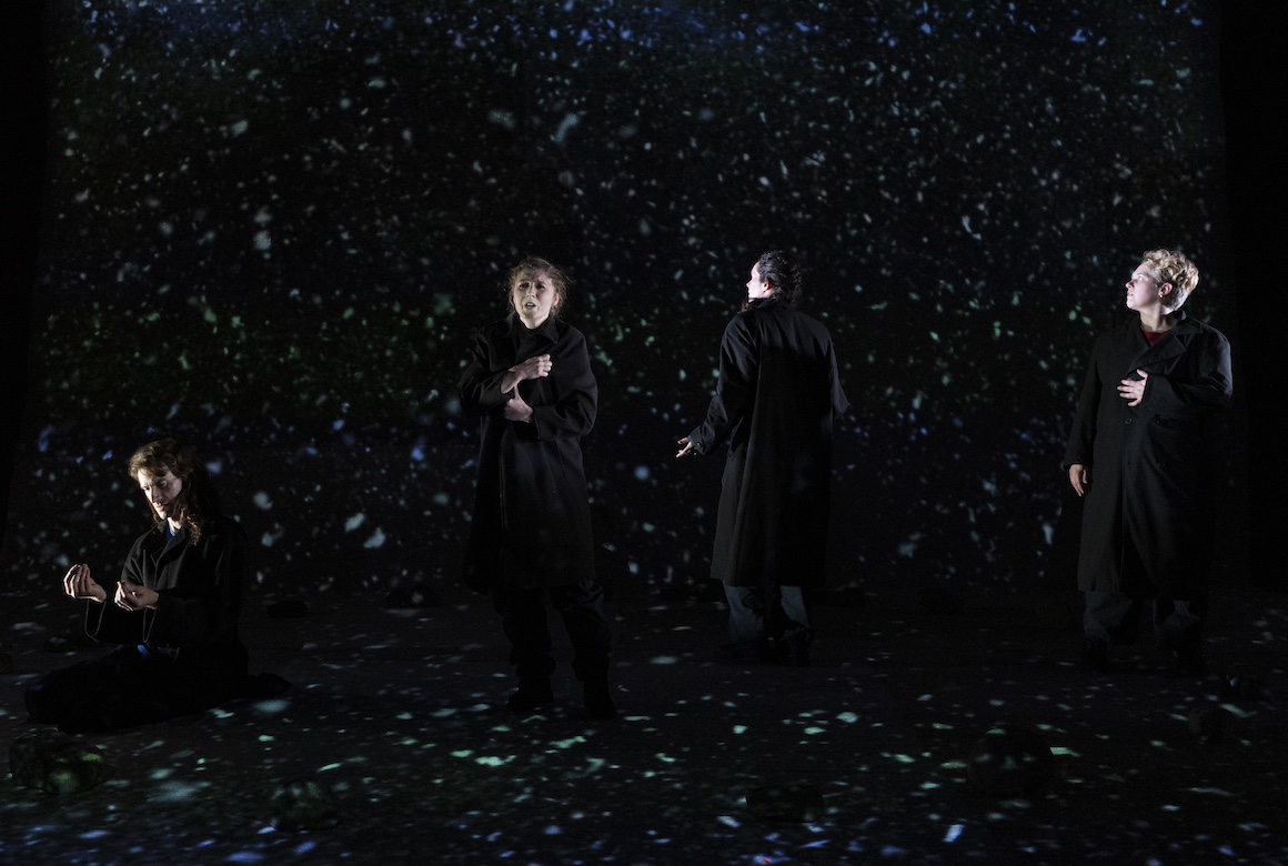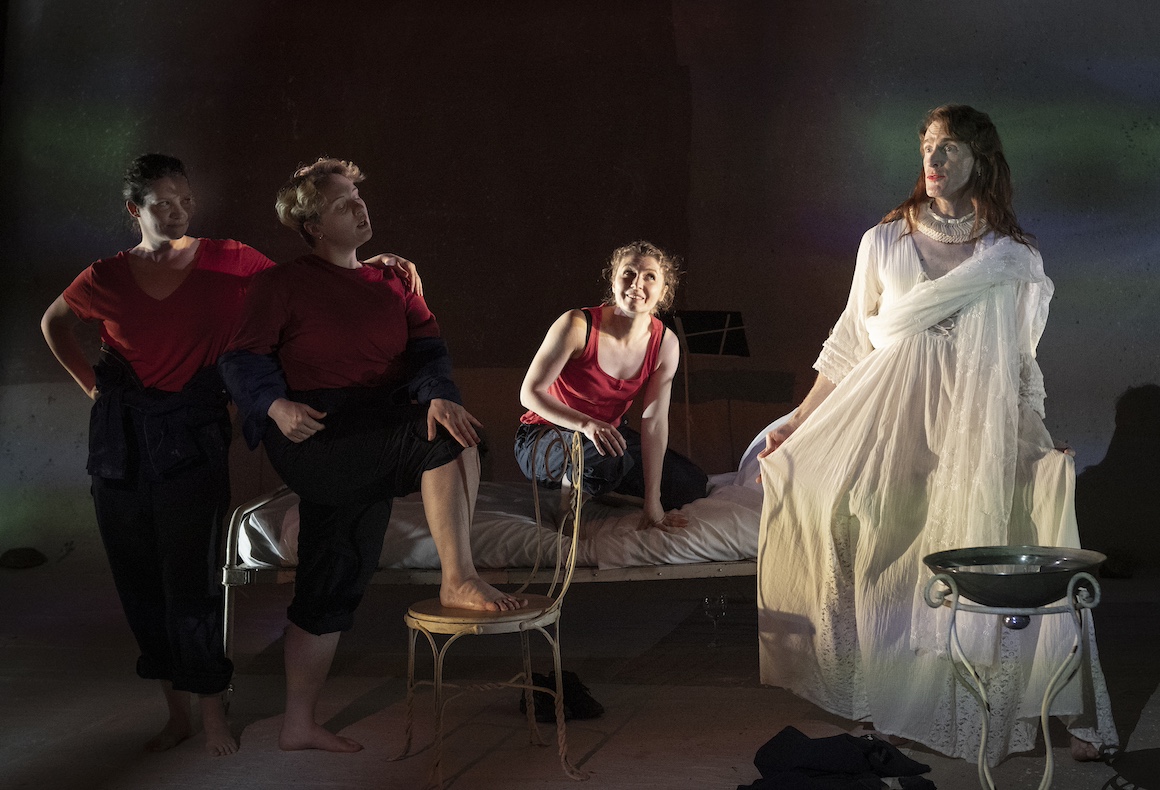 My 2021 review was very much focussed on the piece as a film; as it related to Jarman as a film maker, but it does say everything I have to say about the music, and most of my thoughts about the staging, which I shan’t repeat. Rather I’m going to look at how it felt different as a live show. The cast this time includes many of the originals; Mireille Asselin, Daniel Cabena, Brenna Hardy-Kavanagh and Amahl Arulanadam, who are joined by Danika Lorèn, Hilary Tufford and Hyejin Kwon. Given Daniel’s central role as Jarman or some avatar of Jarman much of the time, the changes didn’t seem particularly consequential.