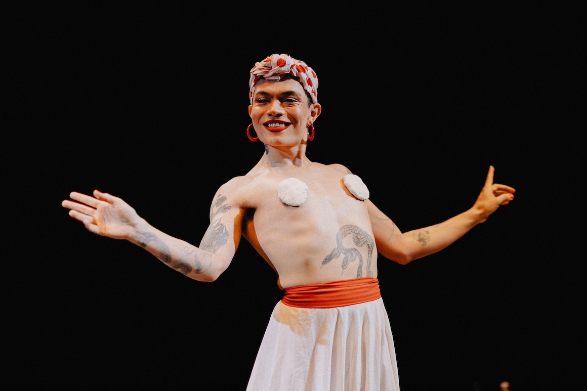 Reina is the name of the woman whose head appears on the packaging of Venezuela’s favourite brand of cornmeal. She’s played by Lujan in drag through multiple lives in which cornmeal is used to communicate with the audience, to actually make arepas (including arepas pasties) and to explore how a staple food is both affected by and shapes the colonial experience. Masa is the food that sustains the Indigenous people and is alien to incomers.