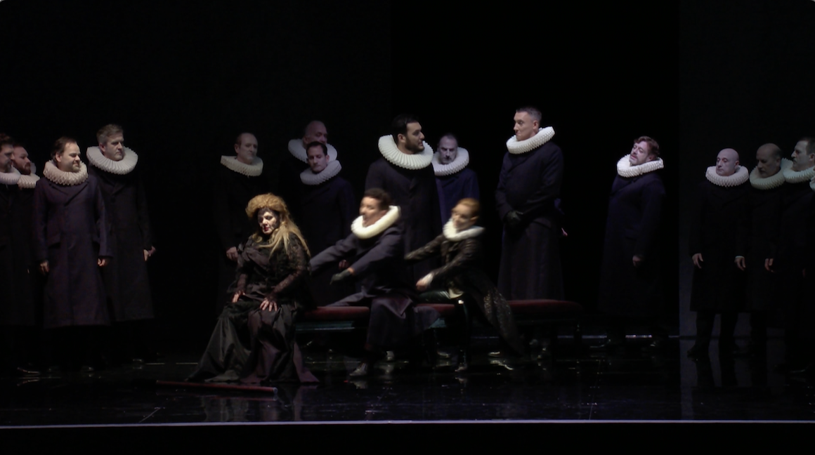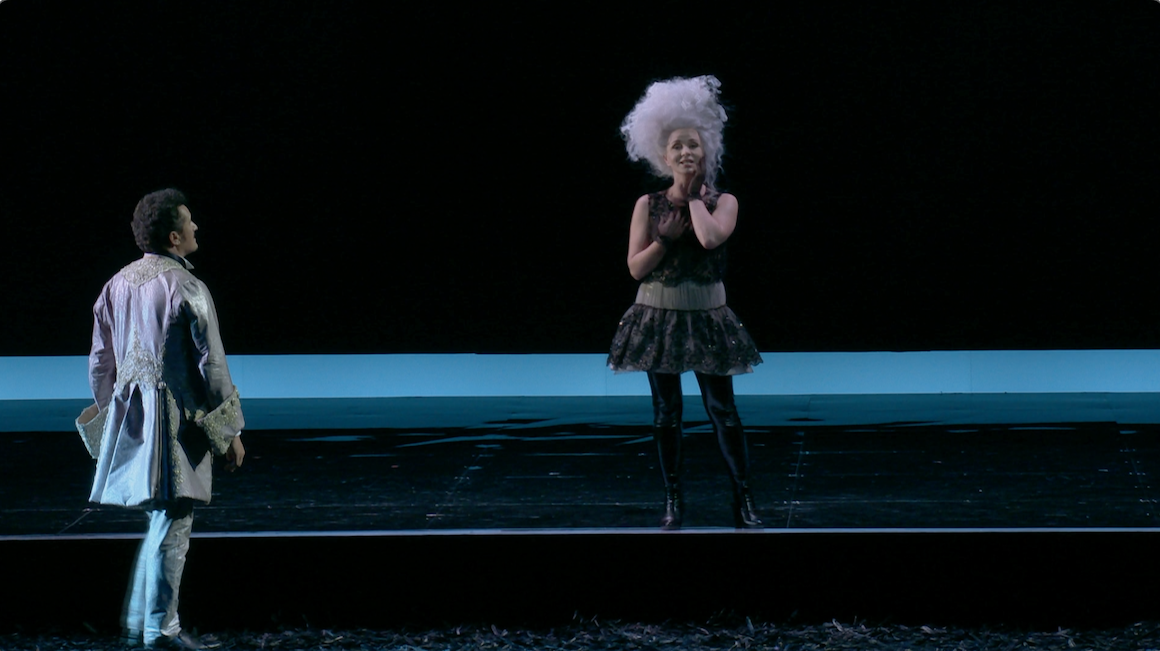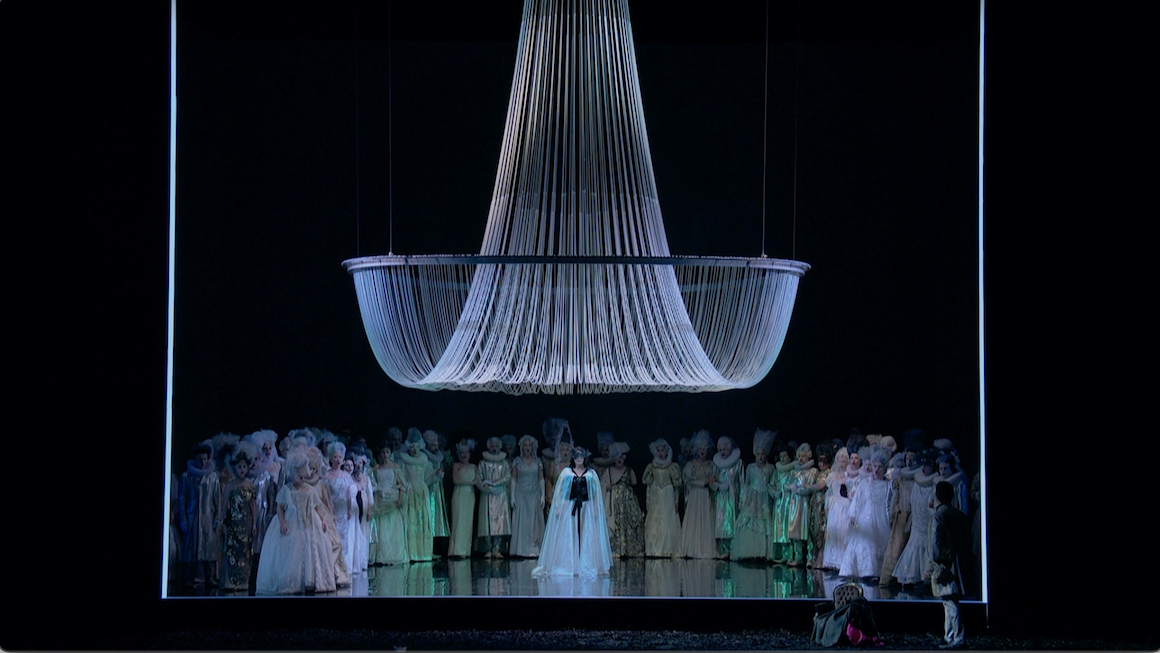 The light box is “enlivened” a bit by a hanging convict in Act 2 and a chandelier like object in the final scene. It isn’t helped much by Christian Lacroix’ costumes which jump around in period for no discernible reason. Mostly the characters (chorus included) are dressed in modern black though for some reason in the scene in Ulrica’s cave they wear big white ruffs (particularly odd since the libretto says Riccardo is disguised as a fisherman). At the beginning and end of the opera Riccardo is dressed as Prince Charming for some reason while at the ball Oscar sports a pouffy skirt and a bouffant hairdo and the chorus appear to be dressed in Mylar space blankets. I don’t see how this clarifies the production concept; if there is one.
