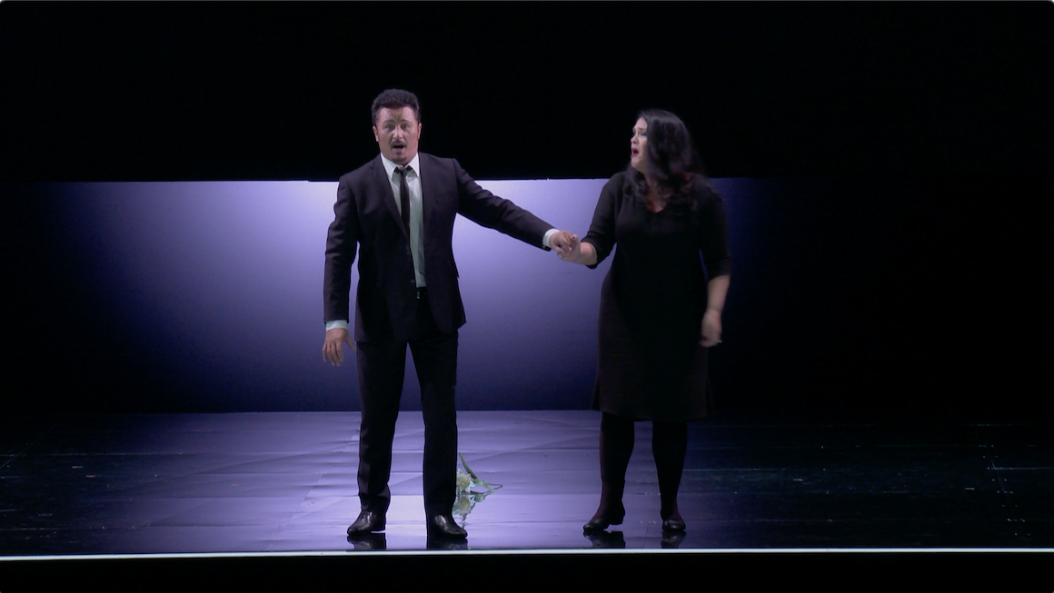 Vincent Boussard’s production of Vedi’s Un Ballo in Maschera staged and filmed at Barcelona’s Liceu in 2017 is dark. Basically there’s a light box in which the characters at front of stage can be seen while others lurk in the darkness. According to the notes Broussard is using light and shadow to bring out the themes of illusion and truth, duty and betrayal. That sounds to me like cleverness masquerading as a production concept and bar a few striking visuals this is hardly a production at all.