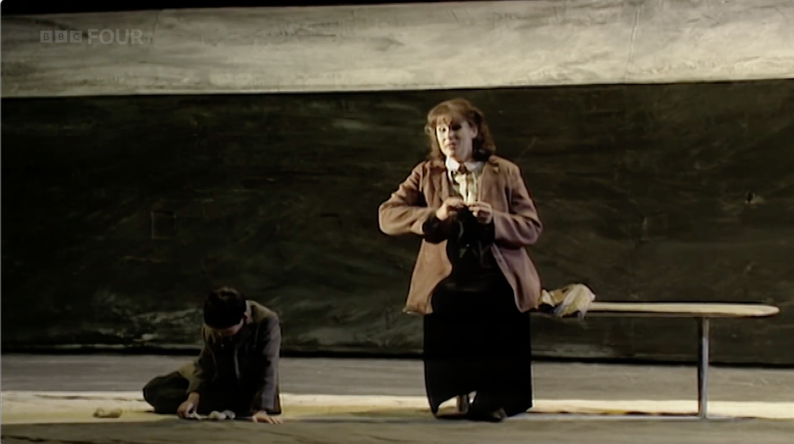 There are indications too that this was not a performance of the production exactly as seen by the Coliseum audience of the time. The credits list a TV make up designer and a TV lighting designer which suggests to me that it was a special performance for the cameras. Nonetheless it’s clearly based on Tim Albery’s staging but has a 1990s “made for TV” feel about it; especially the extensive use of close ups (the Act 3 mad scene is almost entirely head shots) and weird camera angles. TV director Barrie Gavin seems especially fond of filming from directly overhead. I’m still not entirely sure how the extensive use of video (mostly during the Sea Interludes) played out for the live audience. As a device in a film it’s effective enough if a bit obsessed with the dead apprentice.