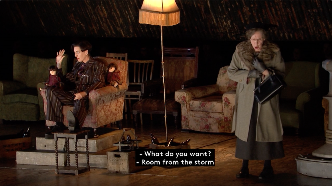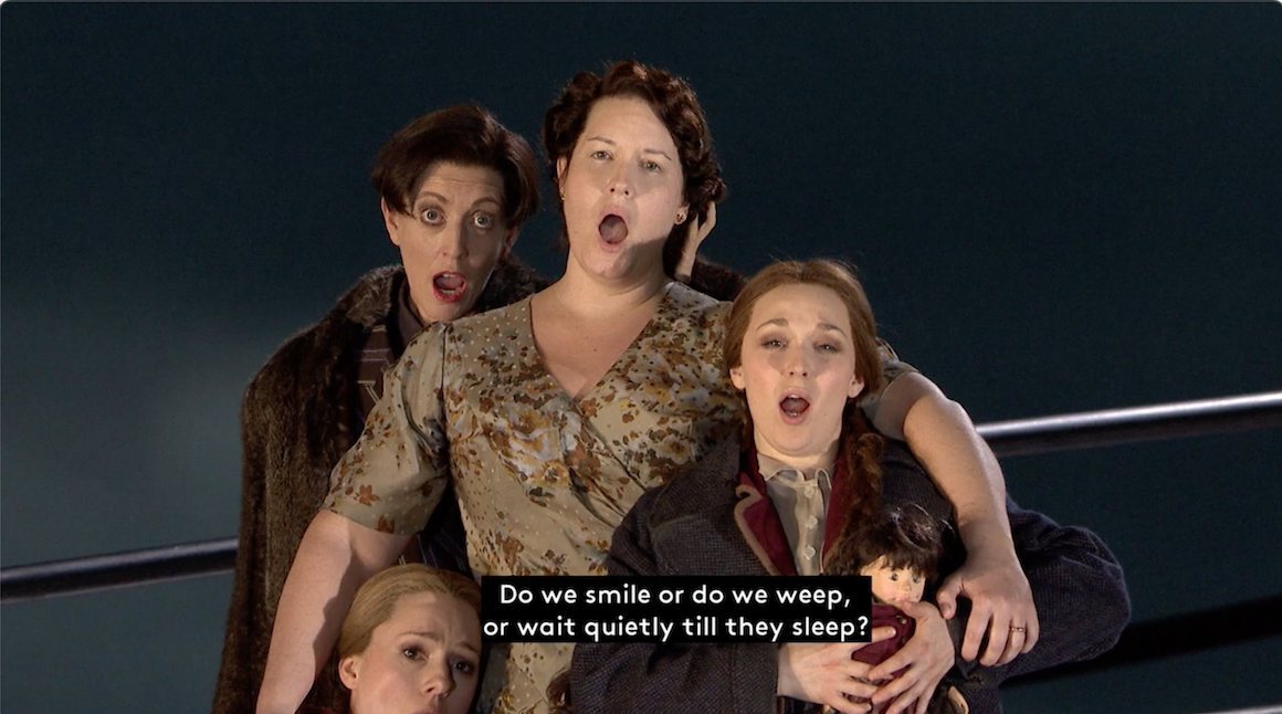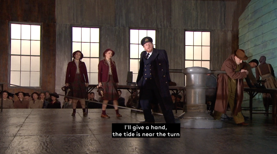 Alden’s production appears to be set in the late 1940s and it’s quite abstract; mostly just trestle tables and a capstan arranged in various ways. It’s also a bit weird. Ned Keene (Leigh Melrose) seems to be some sort of drug addict (which I suppose makes sense) but it’s really Auntie and her nieces who scoop the weirdness pot. Auntie is Rebecca de Pont Davies who is quite striking looking to begin with but in a loud striped trouser suit and fur coat and carrying a riding crop she’s something else. In the “dance” scene she’s also wearing a boar’s head! The nieces; Rhian Lois and Mary Bevan, are played almost as automata; whether it’s in school uniforms carrying weird dolls or in a sailor suit or battle dress they dance together in a weirdly jerky fashion. The apprentice too is played as if he’s seriously autistic, or scared out of his wits, or both. The Act 3 dance is also a bit odd. Not just Auntie and the nieces but Swallow in a pink skirt!
