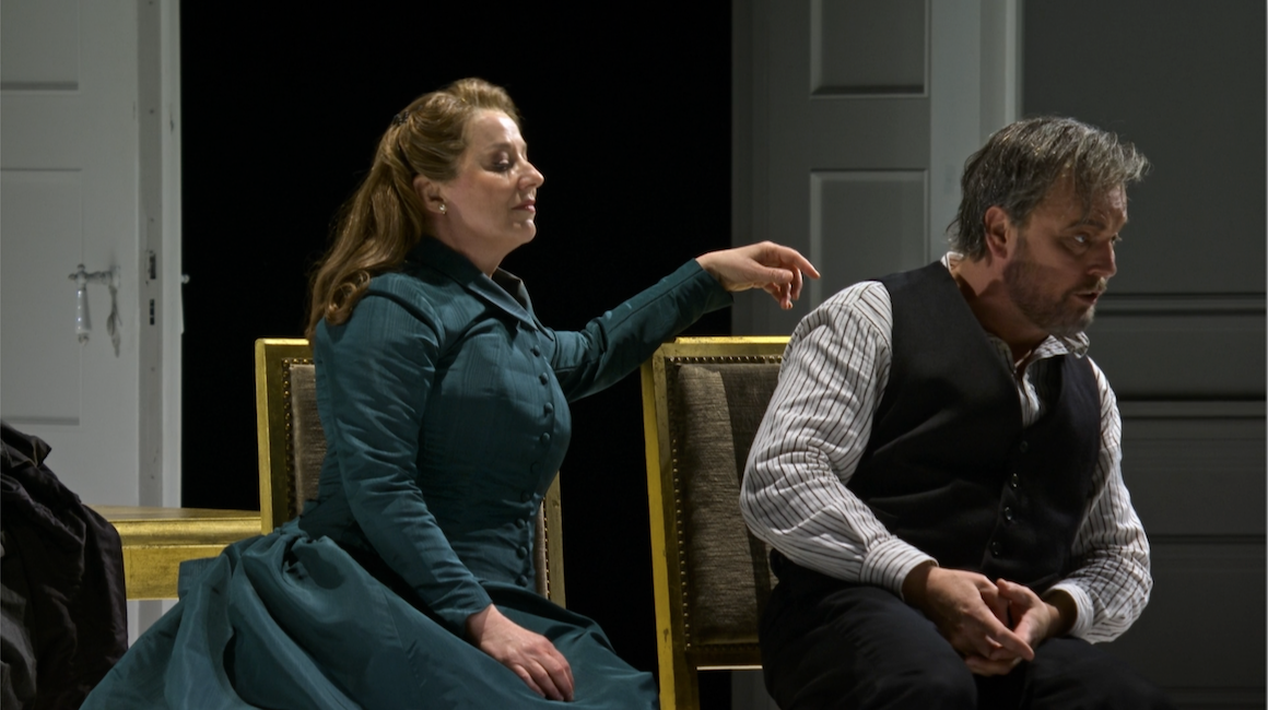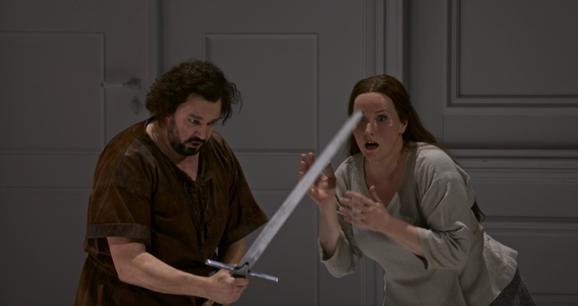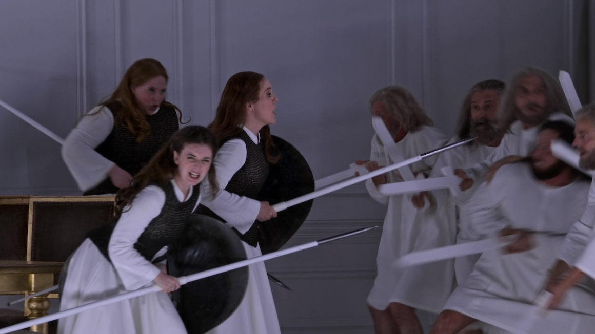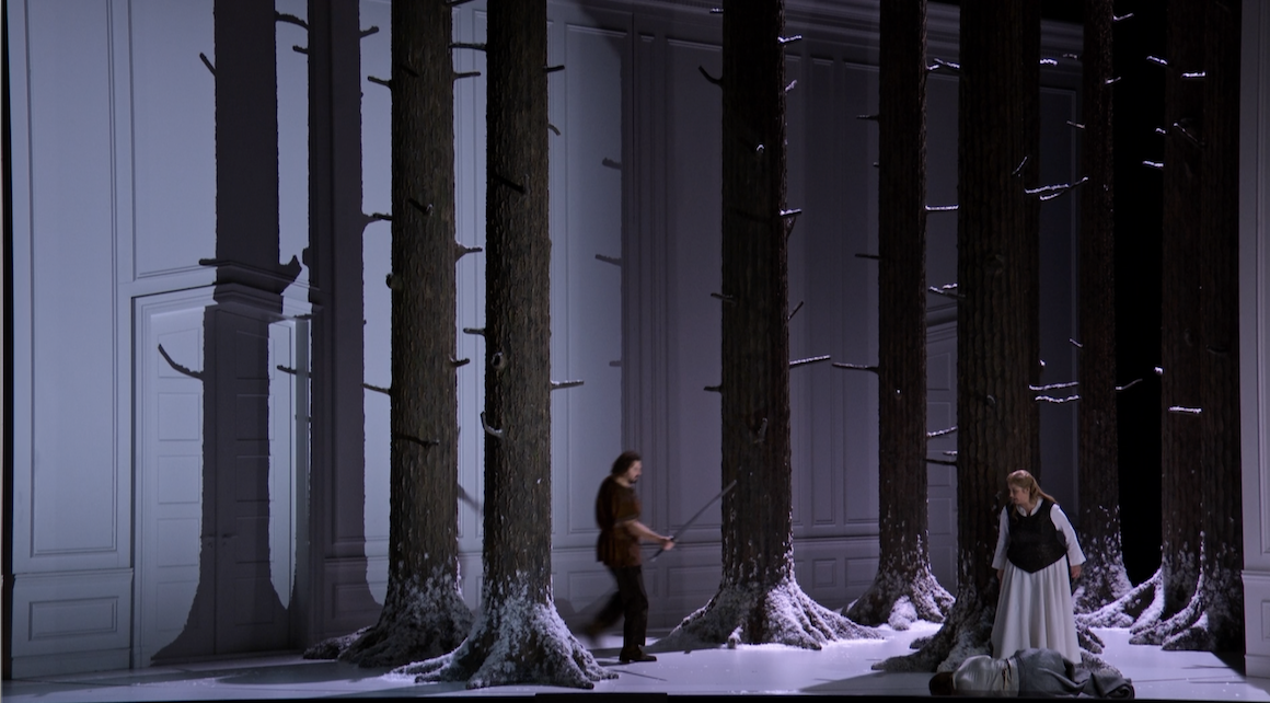 Continuing on from Das Rheingold we come to Die Walküre. There’s a lot of continuity with the earlier work. It’s basically the same rotating set though in some scenes one of the “rooms” becomes a forest. Another thing we see is characters who aren’t canonically “there” appearing in scenes. So right at the beginning, when Siegmund and Sieglinde meet, Wotan is lurking and doing things like handing drinks to Sieglinde. We’ll see more of this with Hunding’s henchmen appearing in various places, Wotan and the henchmen appearing when Sieglinde is describing her wedding and the Valkyries showing up at the start of Act 2.