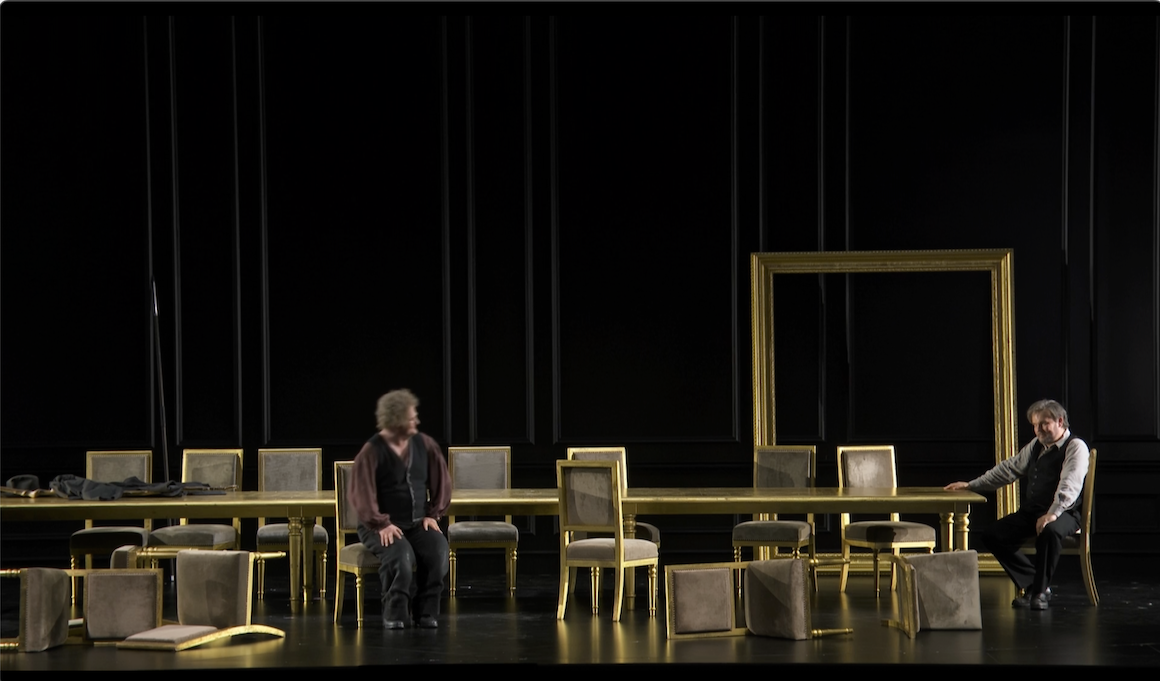 There are continuities and discontinuities with the earlier two operas. It’s the same “rotating mansion” set up but much, much darker. It’s almost like it’s been painted dark grey. It doesn’t rotate nearly as much here either. Long stretches take place with no change of set. One set, used for several different purposes consists of very oversized and rather tatty furniture strewn around.