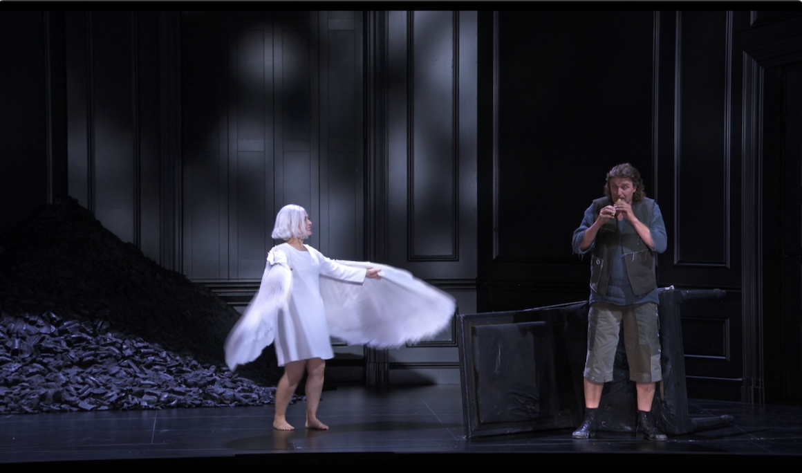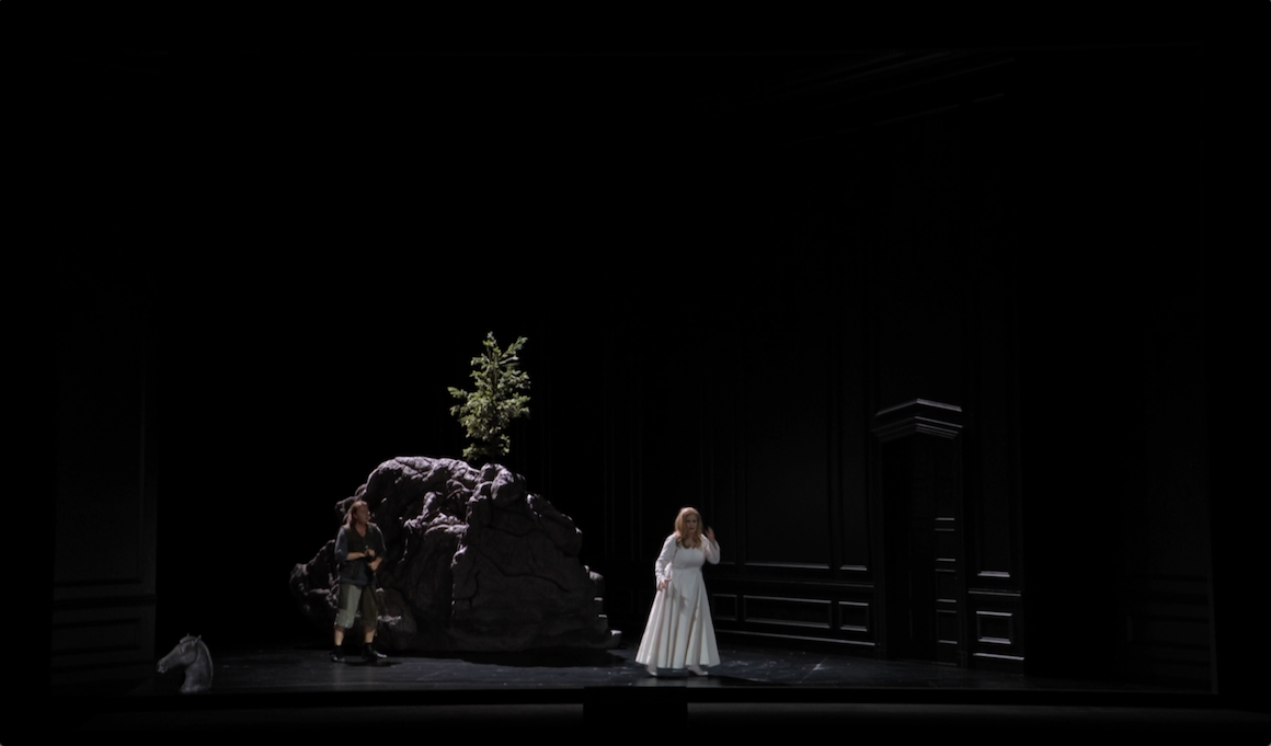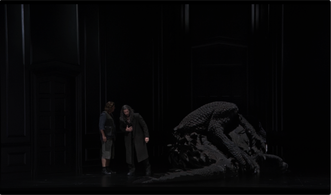 Other settings are very literal. There’s a forge with lots of flame. The rock in the final scene is a rock. Fafner is a dragon. The Woodbird is a soprano in white with flapping wings. But some other, more abstract, elements remain. At key points; right at the end of the riddle sequence, when Wanderer summons Erda and the final confrontation between Wanderer and Siegfried, we are back in the “boardroom” at Valhalla complete with, now empty, picture frame.