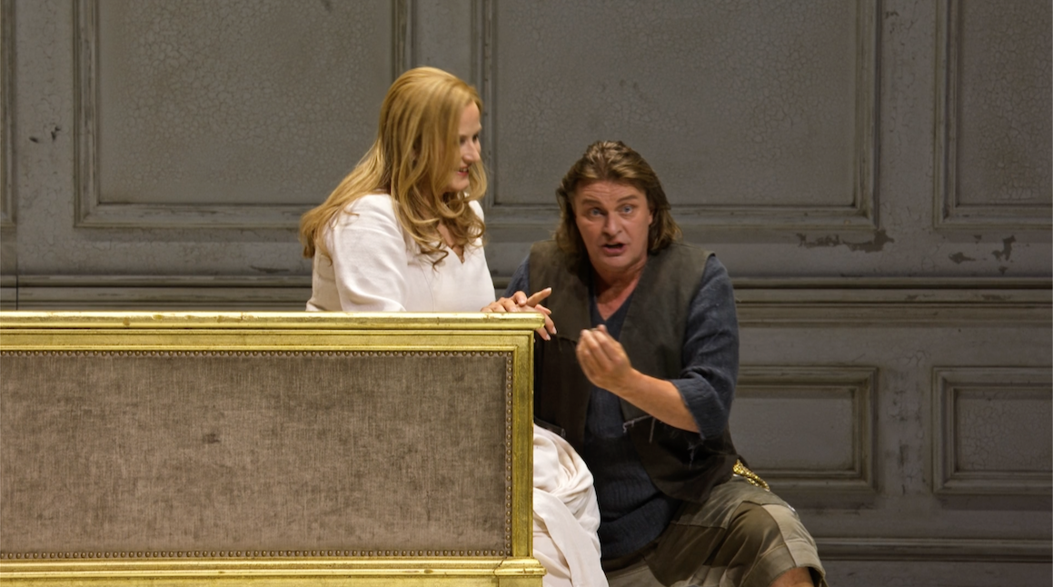 Siegfried and Brünnhilde are in a brightly lit bedroom making out. It’s pretty clear that Brünnhilde knows how things will play out while Siegfried remains clueless. Brünnhilde’s helmet stands in for Grane and when Siegfried puts it on he sort of “canters” around the bedroom. Again, he looks naive, she doesn’t.