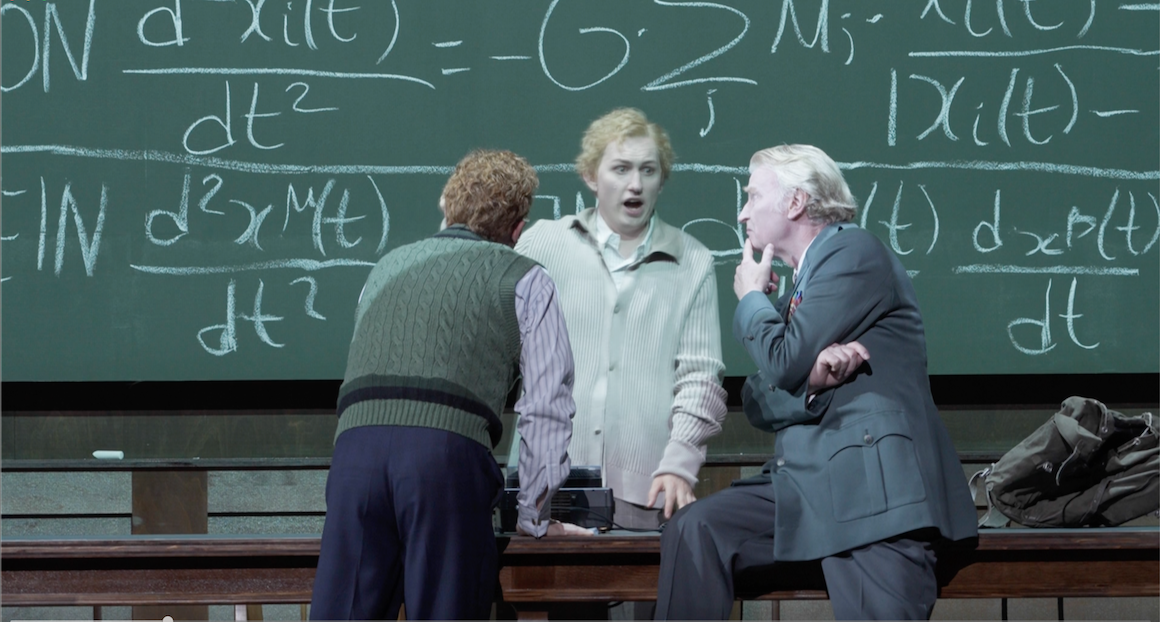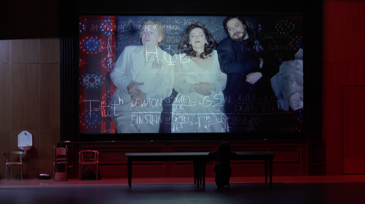 Warlikowski’s staging is fascinating. It’s the Felsenreitschule and he makes full use of the space. The stage surrounds the pit on three sides and there’s a solid back wall. One can’t see the famous arches. On this huge space he disposes several modular mini sets; often with more than one in use at a time. So we have the Yepanchin’s drawing room, Rogozhin’s house and a sort of seating area that serves as a train, a café etc. There’s also a big screen for projections though that’s certainly not the only place projections appear. The screen mostly has writing on it. For most of the opera it’s Newton’s and Einstein’s equations for gravitational acceleration (I think) but characters add bits from time to time like the Alexandra Ivanovna Yepanchin writing “I am strange I dream of chickens”. That one’s in English but some of the other texts are in Russian. At times, and crucially at the end, the projections show the live stage action.