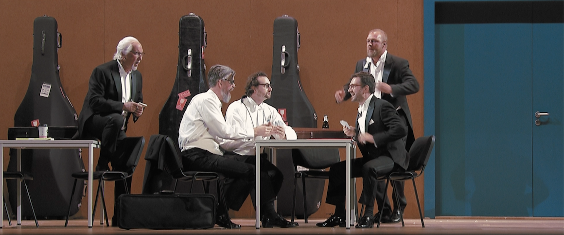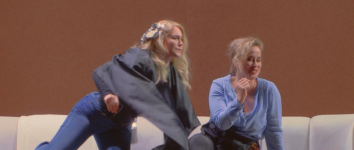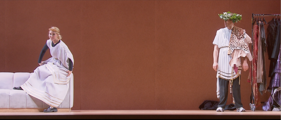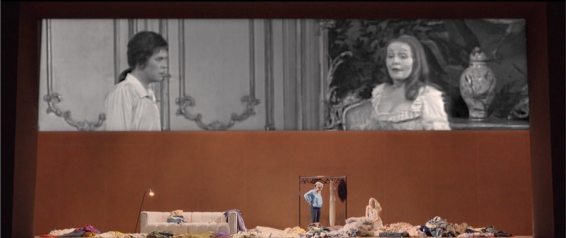 Tobias Kratzer’s production for Deutsche Oper Berlin, recorded in 2024, is characteristically inventive and, equally characteristically, makes extensive use of video projections. In fact the upper half of the stage is a giant video screen with live action beneath it for the most part. He has updated the setting to a contemporary one so letters and cables become text messages and emails, mobile phones are much in evidence and various other elements are updated; Storch returns from tour by plane for example, but it still works more or less as written. The one big exception is that when Christine and her boy toy are discussing whether or not to keep dancing and Christine is complaining that Robert doesn’t dance anymore they are in bed together. Which puts an interesting spin on Christine’s view that Robert having an affair is the end of the world.