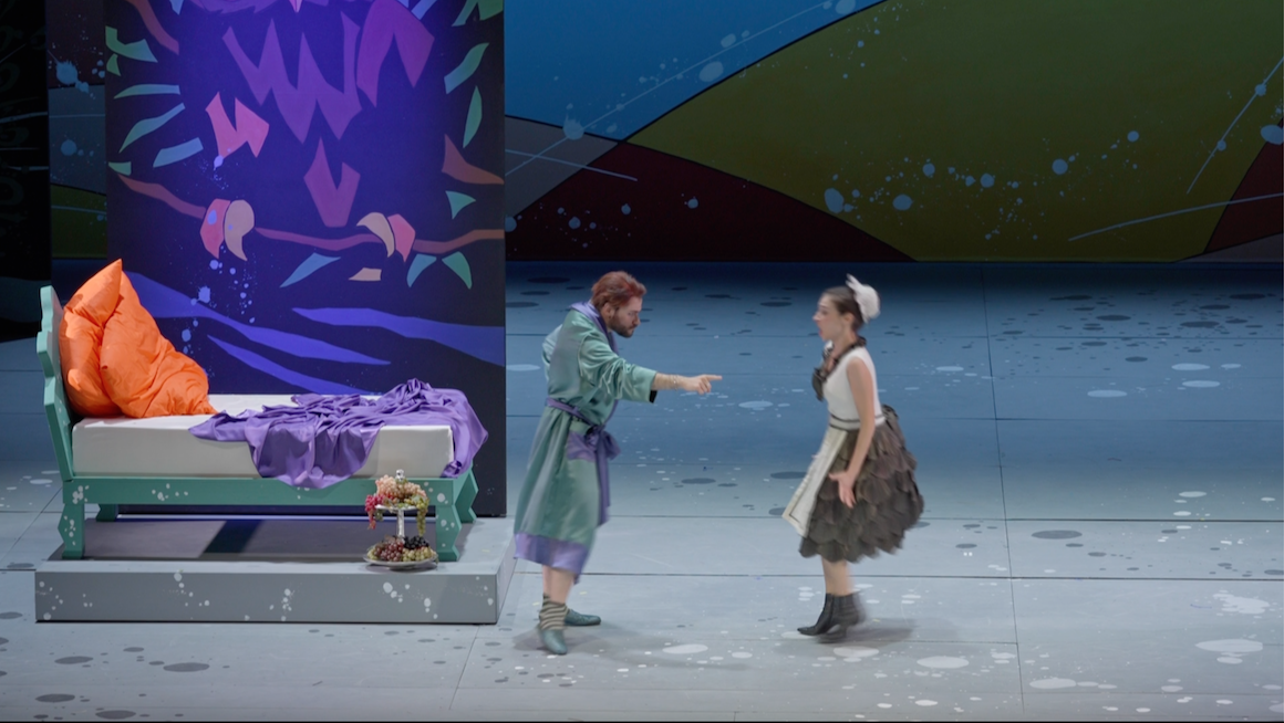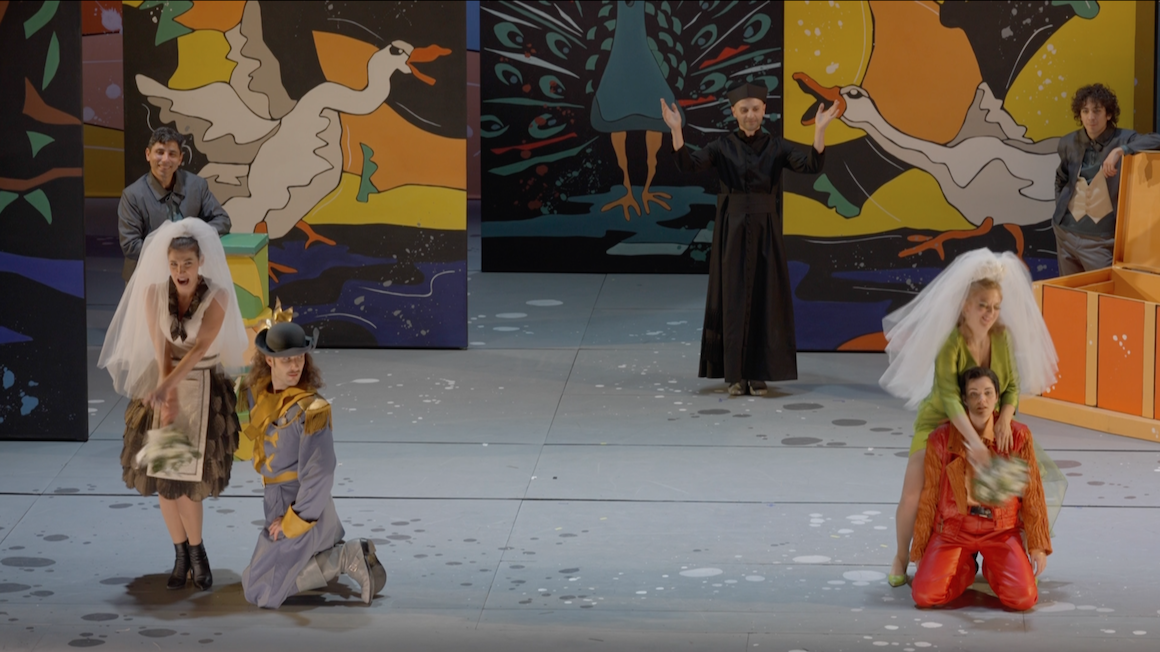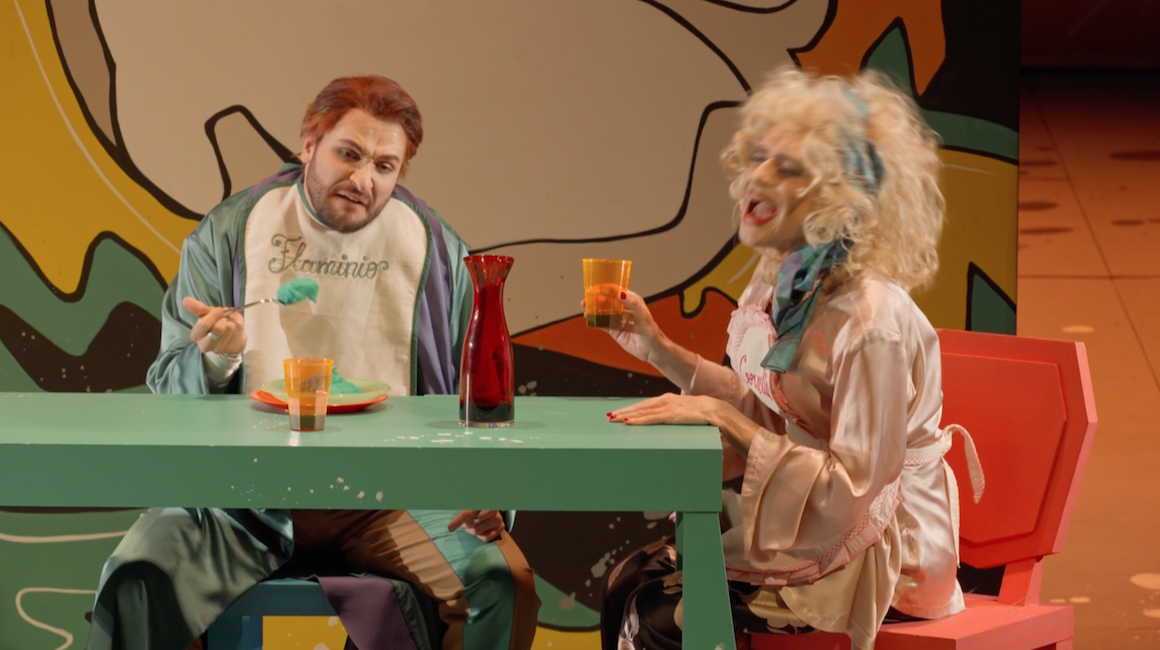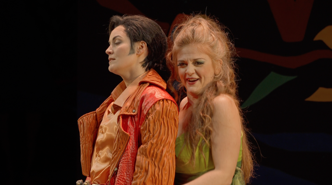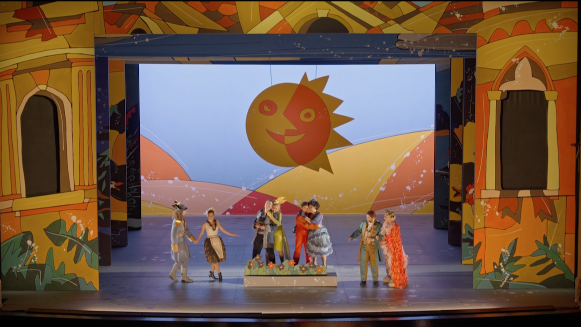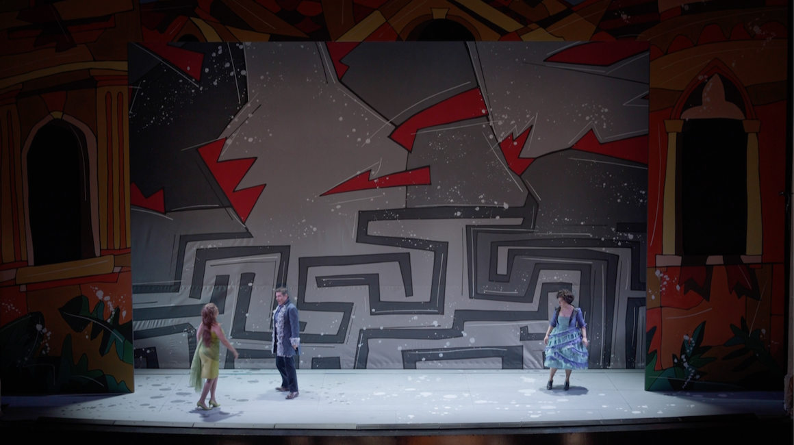 The recording is of a production directed by Stefan Vizioli at the Teatro Malibran in Venice earlier this year. It’s really rather good. Sets and costumes, by painter Ugo Nespolo are a sort of baroque pop art. There are flats and the costumes nod toward the commedia but the colours and the designs are very bright and cheerful. The director keeps the action moving and it never flags.