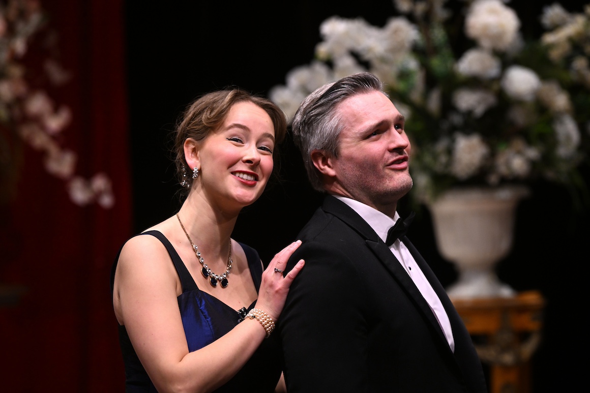 She’s well matched by TOT regular Scott Rumble as Prince Edwin von Lippert-Weylersheim. He looks the part and sings and dances very well. The duets with his leading lady are particularly good. The other romantic pairing is Sebastian Belcourt as Count Bonifazius Kancsianu and Patricia Wrigglesworth as Countess Anastasia. Both are young, tall and have attractively bright voices they work extremely well together particularly in their dance numbers.