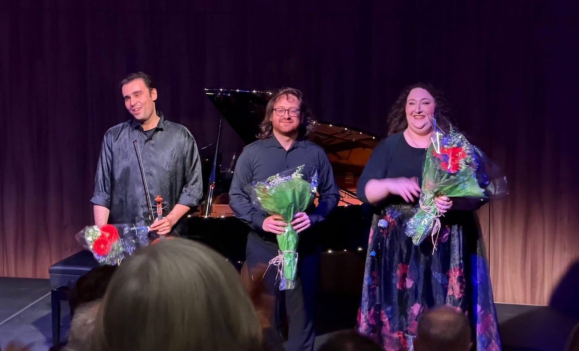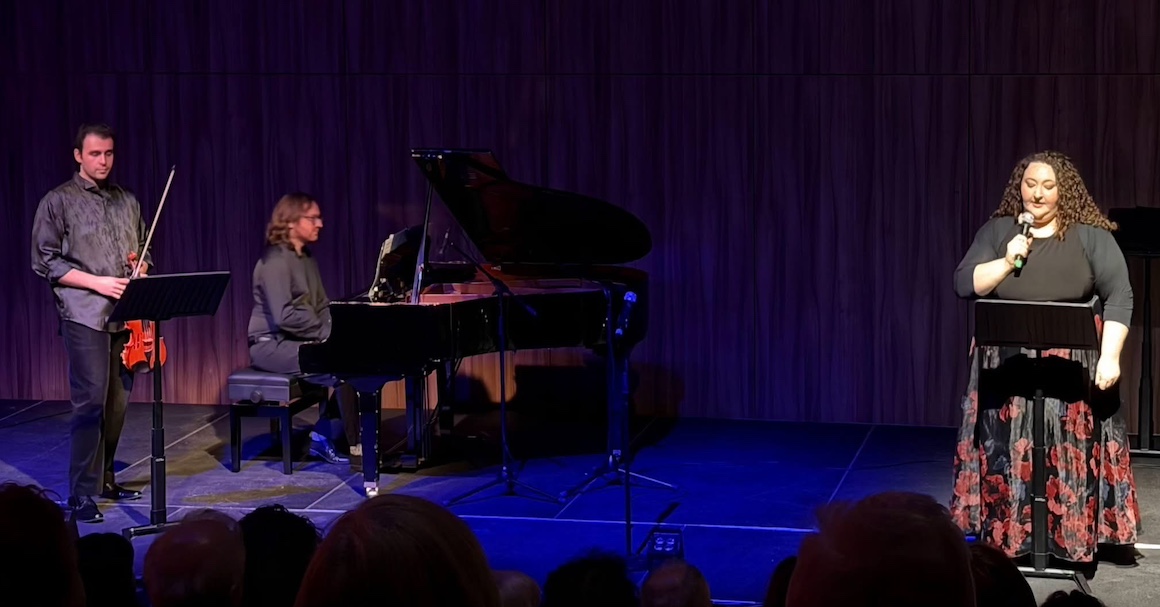 The other change was the location. This year we were at the rebuilt Leah Posluns Theatre at Prosserman JCC on Bathurst just south of the Arctic Circle. It’s a lovely theatre and just the right size for a song recital. What didn’t change was the quality of the performance. Jaclyn (whose voice is sounding better than ever) and Nate own this music and we got nuanced, moving accounts of all the songs definitely enhanced by Daniel on violin.