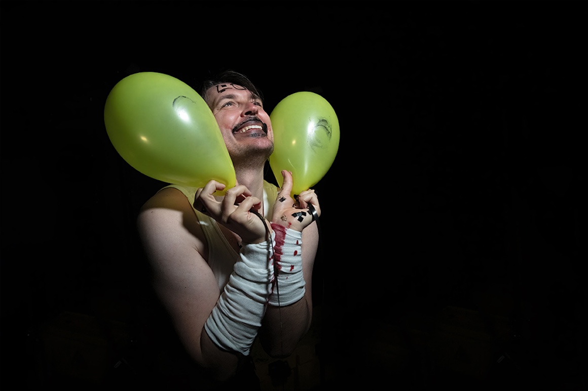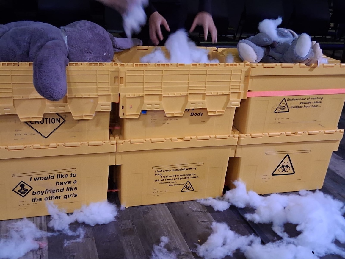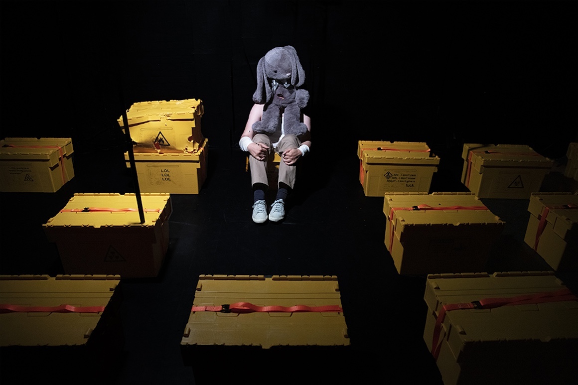Which brings us to the staging. It’s a rectangle with a double row of chairs around three sides with a collection of yellow hazardous material containers, with fragments of the libretto stencilled on them, strategically placed within the performance area. Some of these contain props while others are available for audience members to sit on. So, audience members have the choice of a fairly conventional experience or being in the heart of the action which is engaging to an almost scary degree. Sitting fairly centrally I was scattered with glitter, narrowly avoided flying fragments of dismembered stuffed toy and had “I hate old people” sung repeatedly into my face from about two feet away. Were I to see it again I would definitely choose a box again.