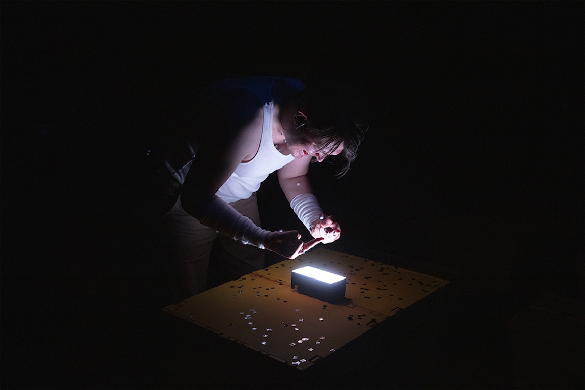 It’s an exploration of loneliness as experienced and described by young people on the Internet during the pandemic. The libretto is taken entirely from online messages and posts which have been organised into ten “songs” by originator and director Louise Beck. They include a boy who dreams of being a slaughtered lamb and a girl who describes herself as The Fucking Ugly Face plus several more fairly despairing and angry vignettes. The music, by Matilde Böcher and Asger Kudahl, consists of countertenor Morten Grove Frandsen singing both live and on prerecorded backing tracks. There’s a lot of electronic processing applied to both. Much of it, given the visceral nature of the texts, is quite melodic and gentle but there are some pretty harsh passages too. The sound is relayed to the audience via speakers placed in the corners of the performance space.