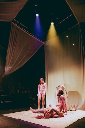 herakles ii and herakles iii appear and go through variations on the same theme; doing, not doing, time for love, time for sex, waiting, expecting. It’s both verbal and physical. The ensemble; all of fluid gender, engage and interact in ways that might or might not be appropriate depending on context but we don’t really know what the context is so, naturally, it generates lots of laughs. The lighting is evocative, the sound world (Philip Nozuka) loud and somewhat disorienting.