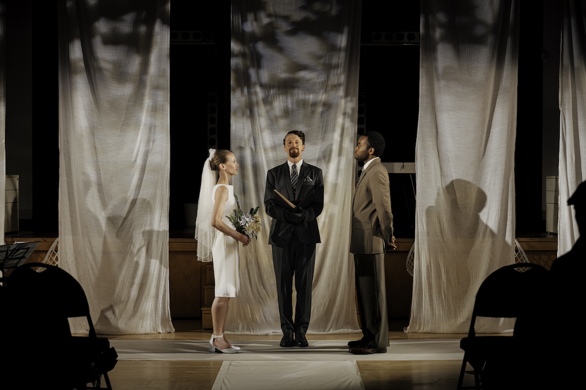 Sam Holcroft’s A Mirror opened on Thursday evening at 918 Bathurst in an ARC production directed by Tamara Vuckovic. It’s a complex play with many levels and multiple places where the boundary between play and audience dissolve. The first “framing device” has us as the audience for an “unlicensed” play which s being performed under the cover of a wedding.