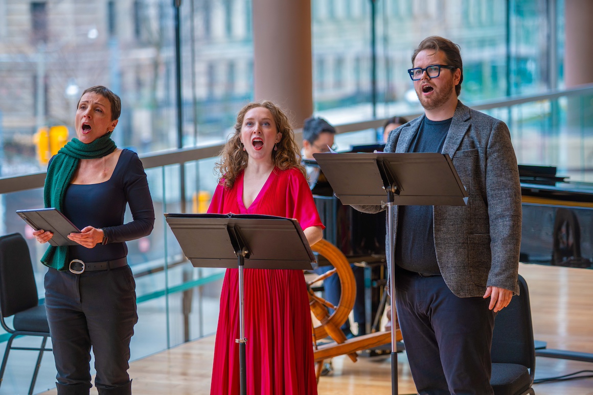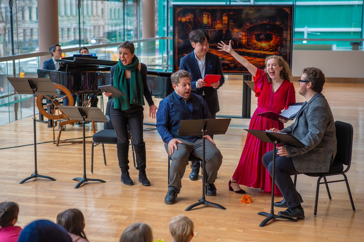 It was a barebones affair; no costumes, few props, just a video screen, and it was sung off book though the singers; directed by Renée Salewski, acted as best they could in the circumstances. Actually they threw themselves into it to the delight of the youngsters. I especially liked Andrea Ludwig’s toothy wolf and Maeve Palmer being impossibly cute as all the fairy tale heroines.