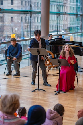 It was a barebones affair; no costumes, few props, just a video screen, and it was sung off book though the singers; directed by Renée Salewski, acted as best they could in the circumstances. Actually they threw themselves into it to the delight of the youngsters. I especially liked Andrea Ludwig’s toothy wolf and Maeve Palmer being impossibly cute as all the fairy tale heroines.