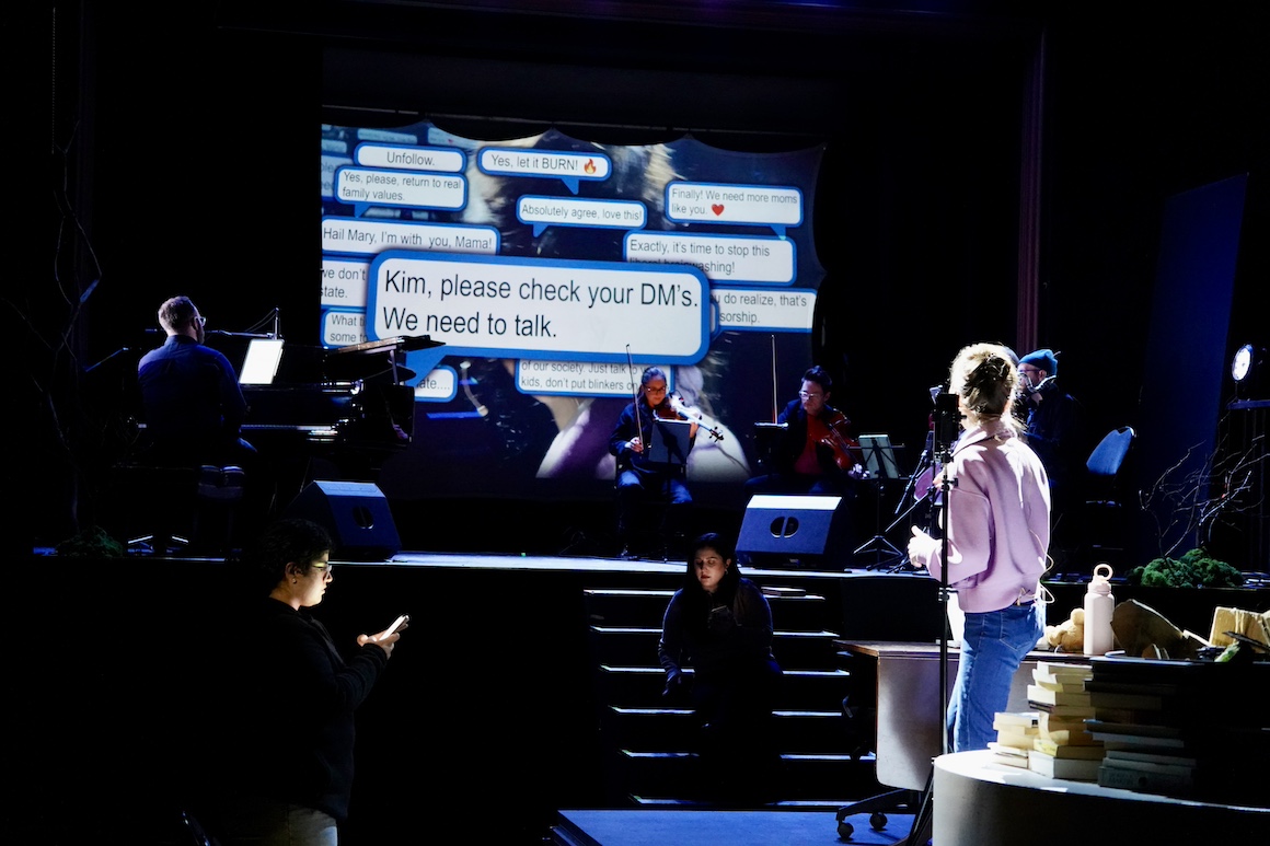 Sarah Slean’s Kimberly Dunbar (libretto by Royce Vavrek) foregrounded a woman in (apparently) small town Alberta trying to purge her town library of anything she deemed offensive to her “family values”, culminating in a book burning, which at least harked back to Jenn’s campfire theme. Text messages, video calls and the like surfaced some opposition but essentially a lynch mob emerged and a lynch mob is still ugly when it’s made up of self righteous suburban moms. Slean’s poppy/romantic score seemed to underline the essential banality of her character reflecting Arendt’s well know aphorism. I get what Slean and Vavrek were trying to do here but I’m not sure it really worked.