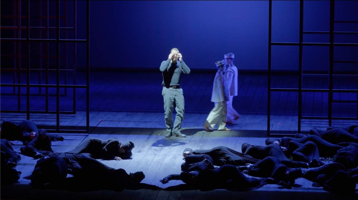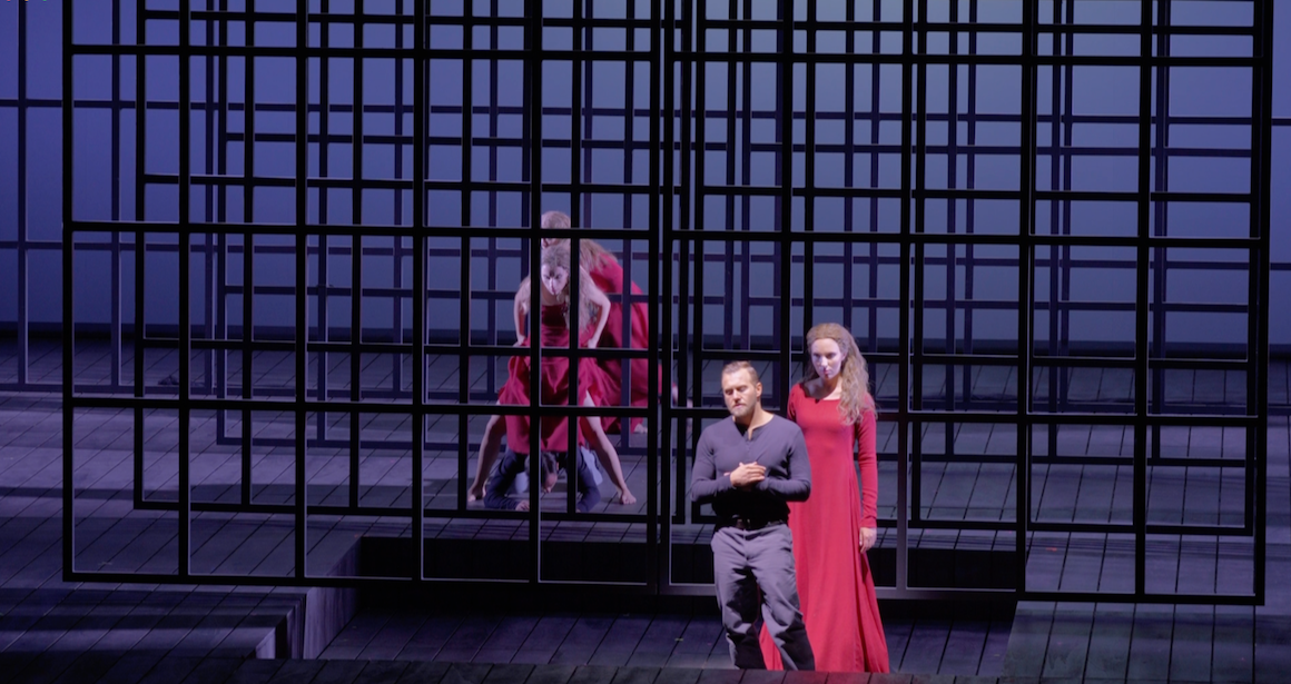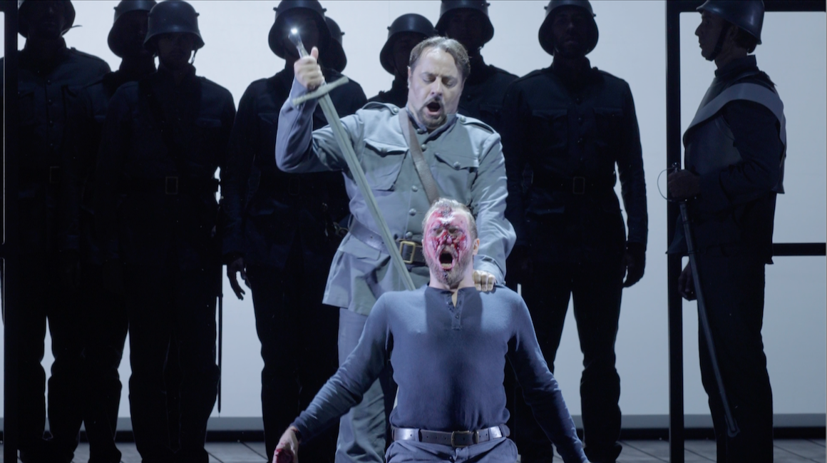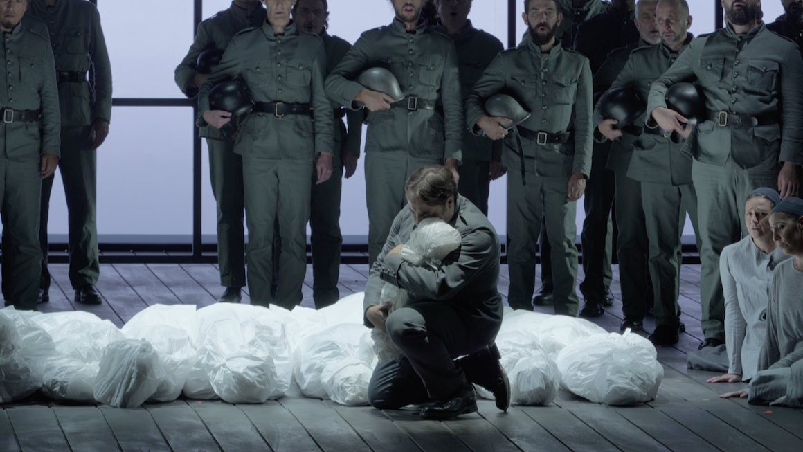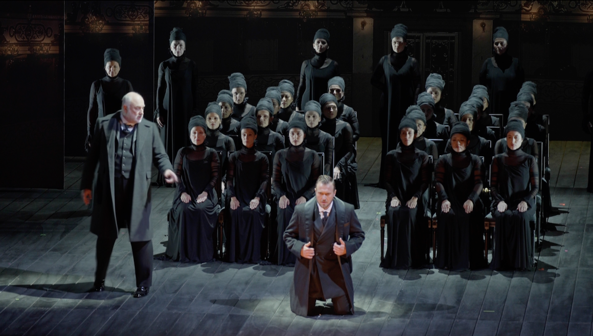It does feel different in French though. That’s particularly the case here as director Pierre Audi has translated the action to what looks the Third Republic in the run up to WW1; performative politics over a deeply rotten core. Costuming (Robby Duiveman) starts with tail coats, dress uniforms and formal dresses but Macbeth dresses down as he gets more unstable. By Act 4 the uniforms look 1916ish and vaguely Teutonic. The ladies of the chorus are dressed in black with black turbans. It’s quite austere except for the dress uniforms and some of Lady Macbeth’s outfits. The staging is quite abstract. There’s a sort of lattice thing at the back of the stage and a lift at centre stage. Early on there’s a lot of use of rows of chairs and quite phalanx like movement of the chorus which feels almost like a Robert Carsen production.