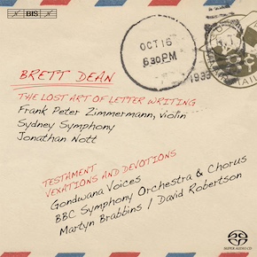 The latest recording of Australian composer Brett Dean’s music on the BIS label contains three quite substantial pieces. The first is a violin concerto in three movements; The Lost Art of Letter Writing which is played by Frank Peter Zimmermann with the Sydney Symphony conducted by Jonathan Nott. The four movements are each inspired by a 19th century letter (the details can be found here). Collectively they form a fairly conventional concerto structure; a fast movement, a slow movement, a sort of scherzo and a very fast, busy and insistent conclusion. It’s complex, dense and chromatic music that sometimes builds tension much in the manner of Shostakovich though Dean’s way of resolving that tension is very different. It’s a really rewarding piece.
