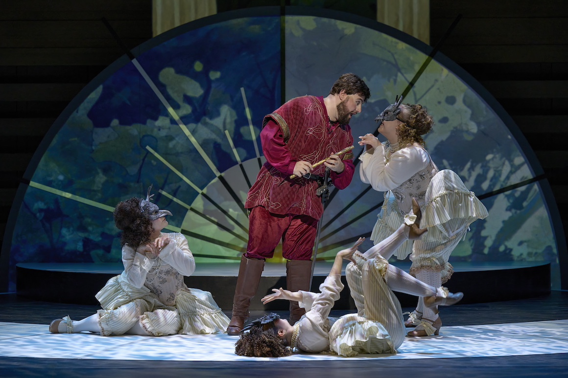 The Glenn Gould School gave the first of two performances of Mozart’s Die Zauberflöte at Koerner Hall on Wednesday evening. The production is directed by Allison Grant and is pretty straightforward, though quite heavily cut. The “look” is maybe Miyazaki animation (costumes by Alex Amini) with a minimalist backdrop (Kim Sue Bartnik) which is enlivened by interesting projections by Nathan Bruce and quite striking lighting by Jason Hand. There’s a sort of dumb show during the overture that the Director’s Notes imply is something to do with the opera being about a dysfunctional family (what opera family isn’t?) but the idea isn’t developed at all.