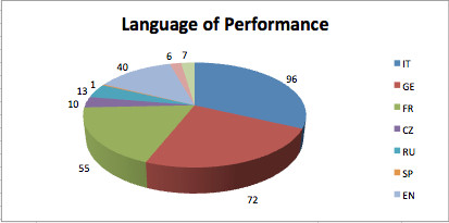 The first thing I looked at was language of performance. It’s no surprise that Italian (96) and German (72) dominate the list. French is a strong third at 55. English comes in at 40, almost all 20th and 21st century works. Other (7) is quite interesting as it mostly reflects works in multiple languages such as Tan Dun’s Marco Polo. “Other” is very much a modern category. Continue reading