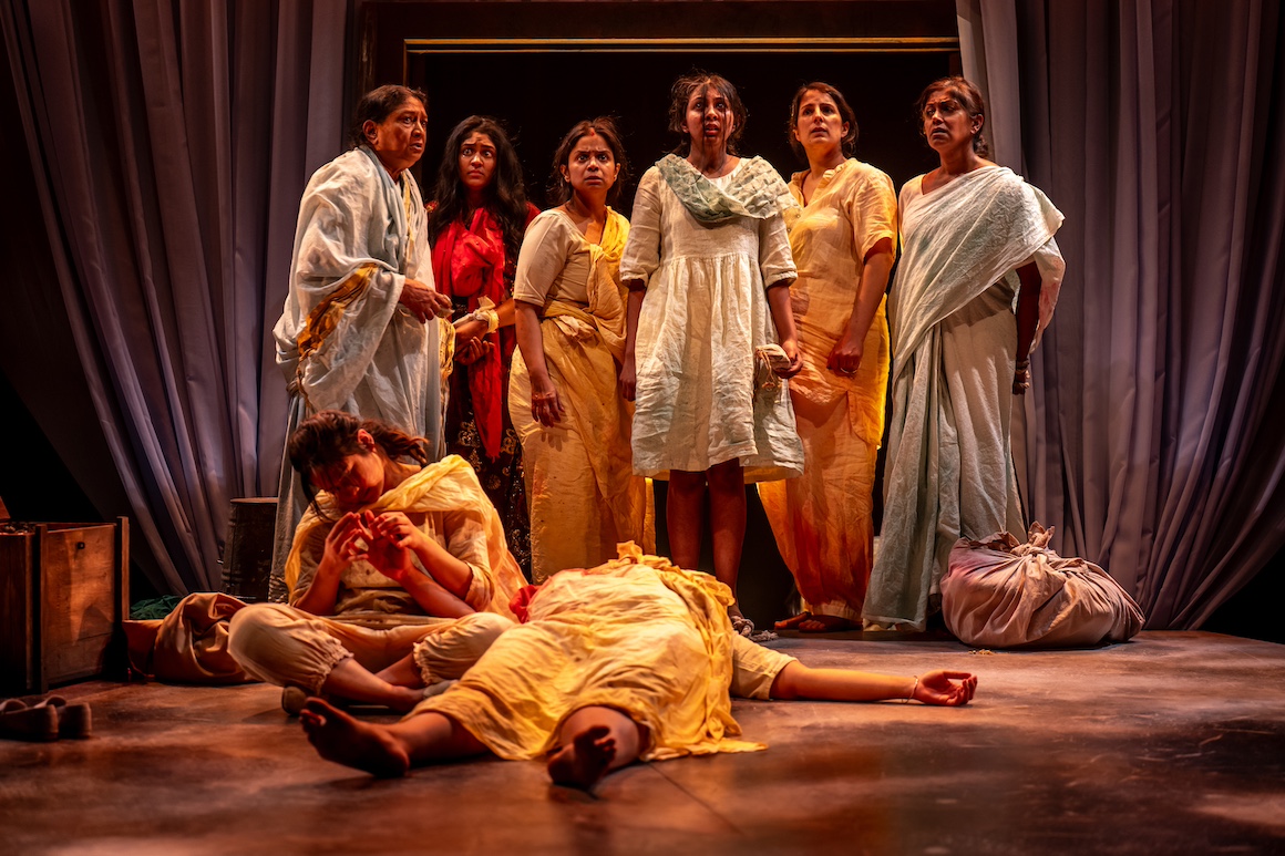 Trident Moon, by Anusree Roy and directed by Nina Lee Aquino opened at Crow’s Theatre on Friday night. It’s set in 1947 during the Partition of India and concerns a bunch of women in the back of a truck seeking safety in what has become India. Arun is a Hindu servant to a Moslem family. Her boss, presumably to show he is not soft on Hindus, has beheaded her husband and sons. In revenge she has shot him and kidnapped three of his women folk in the hope that they can be multiply raped by Hindu men when they reach “safety”. The truck also contains her sister who has been accidentally, but seriously, wounded in the shooting, her retarded daughter and a box with the three heads. The truck is driven by her brother.